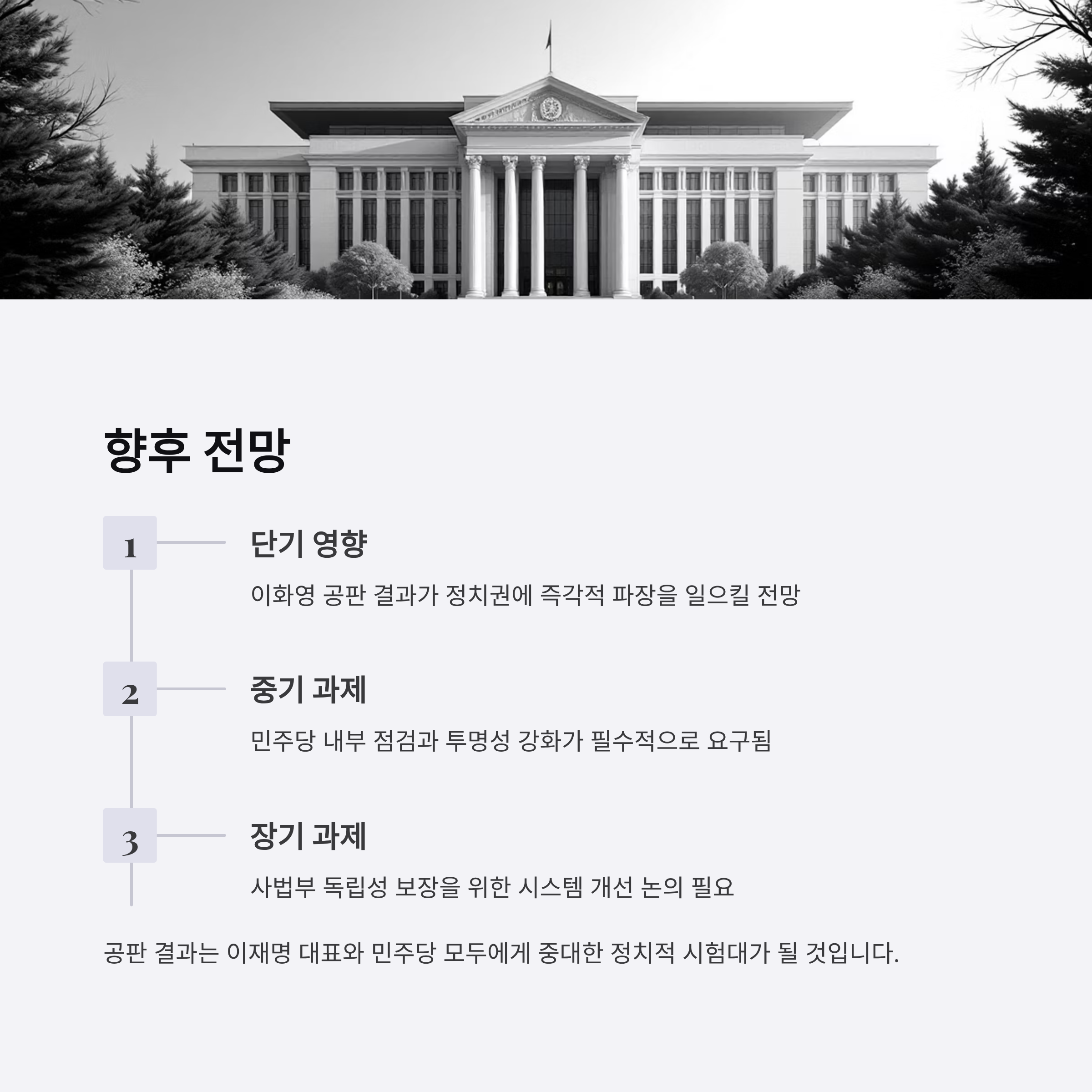 이번 사건은 민주당 내부의 리더십 갈등과 구조적 문제를 드러낸 대표적인 사례로 평가됩니다. 이화영의 진술 변경과 변호사 교체 과정은 단순한 법적 사건 이상의 정치적 뉘앙스를 함축하고 있습니다. 이에 따라 민주당은 사건의 명확한 해명뿐 아니라, 당의 투명성과 공정성을 강화하는 내부 점검이 필수적입니다. 나아가 민주주의의 근간을 이루는 사법부 독립성을 훼손할 가능성이 제기되는 상황에서, 국민적 신뢰 회복을 위한 시스템 개선이 논의돼야 할 것입니다. 향후 공판 결과는 이재명 대표와 민주당 모두에게 정치적 시험대가 될 가능성이 높으며, 결과에 따라 정치적 파장은 상당할 것으로 보입니다.