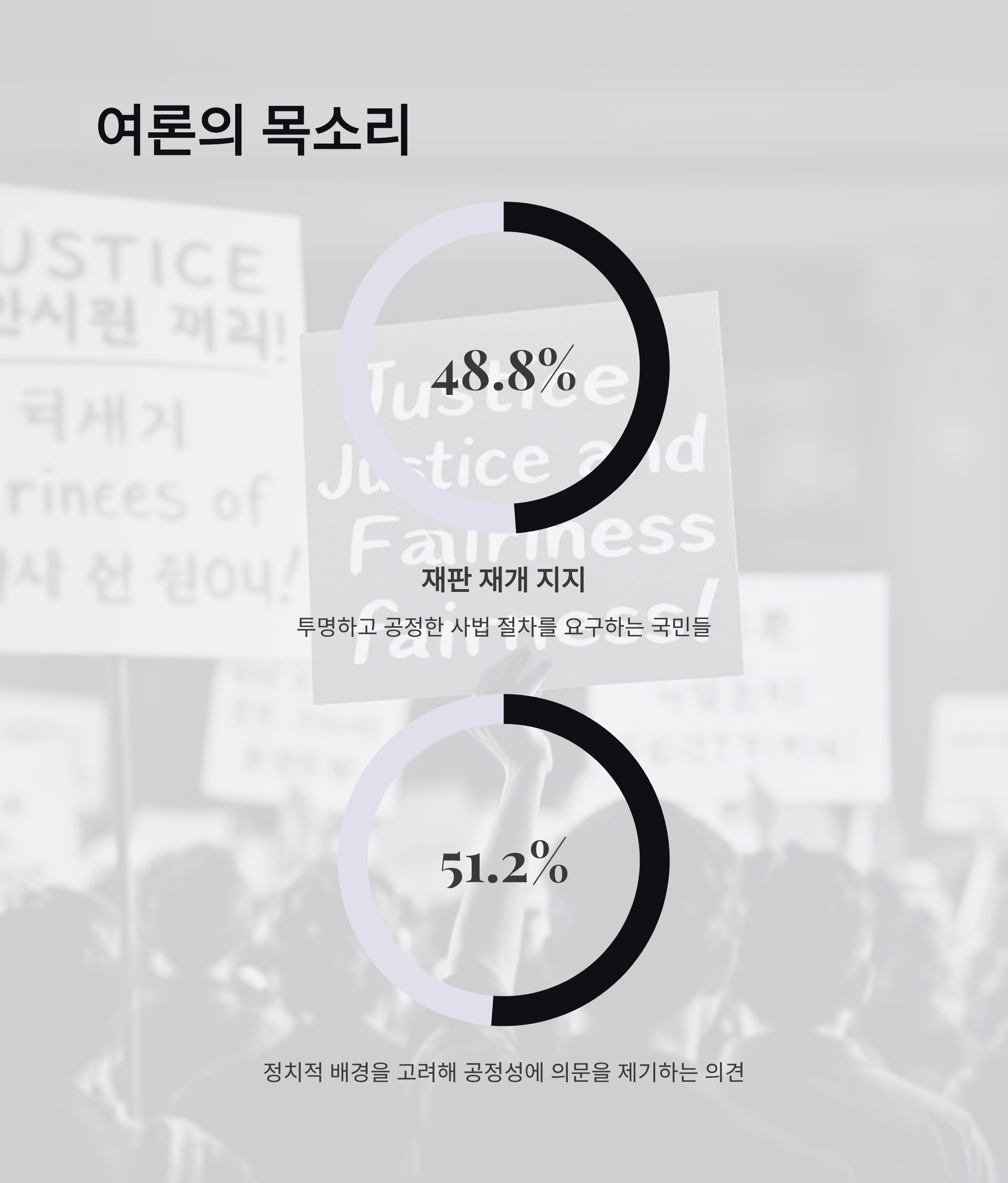4. 국민 여론은 재판 재개 필요성에 대해 약 48.8%의 지지를 보이고 있습니다.