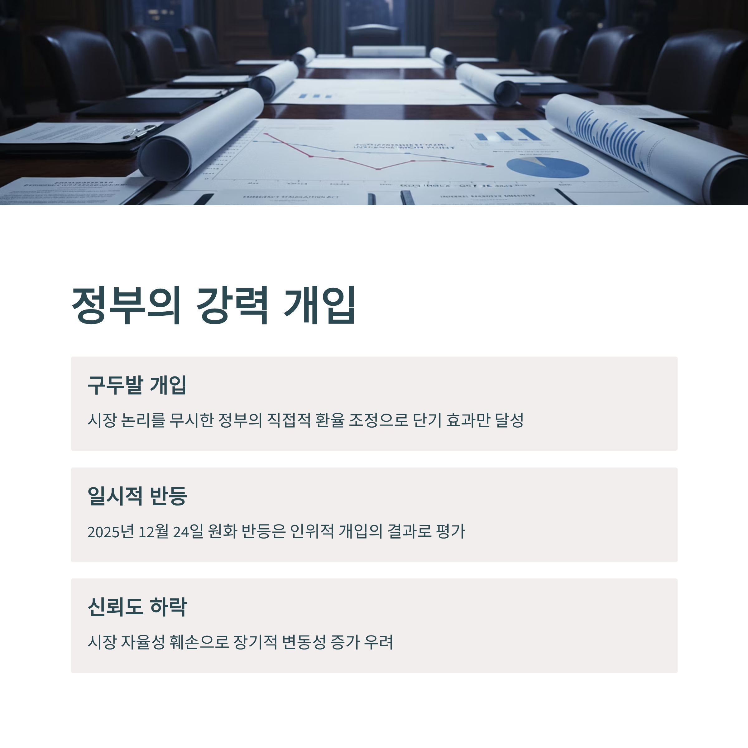 2025년 12월 24일 대한민국 외환 시장에서 드물게 나타난 원화 반등은 정부의 강력한 개입으로 촉발된 일시적인 현상이었습니다. 현재 이재명 정부는 급등한 환율에 대응하기 위해 강도 높은 정책을 시행하며 사실상 시장에 '구두발 개입'을 하고 있다는 평가를 받고 있습니다. 그런데 이러한 인위적 환율 관리가 가져올 장기적 영향은 무엇일까요? 환율 방어를 위한 정부의 특별한 조치는 환율 하락이라는 성과를 가져왔지만, 그 이면에는 심각한 시장 신뢰도 하락의 위험이 숨어 있습니다.
