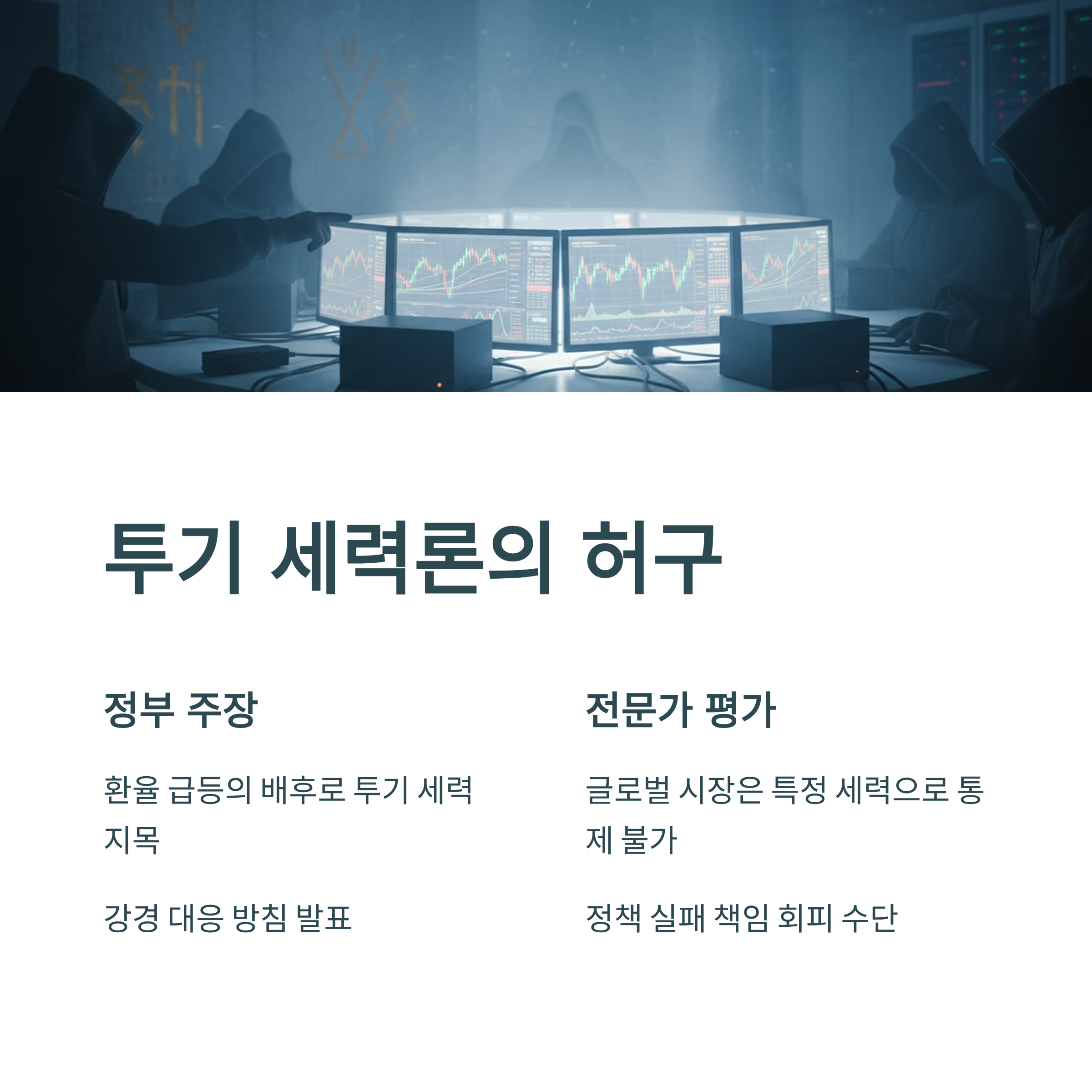 투기 세력을 언급하며 강경 대응 방침을 밝힌 정부는 환율 상승의 책임을 외부 요인으로 규정했다. 그러나 글로벌 환율 시장에서의 압도적인 자본 흐름은 특정 세력의 의도만으로 흔들릴 수 없는 구조이다. 전문가들은 정책 실패의 책임 회피를 위해 투기 세력이라는 '보이지 않는 적'을 설정한 것이 사실상 핵심 문제를 회피하는 태도라고 지적했다. 환율 안정에는 외화를 보유하고 있는 기업의 수출 경쟁력을 강화하는 등 더 본질적인 접근 방법이 요구된다.