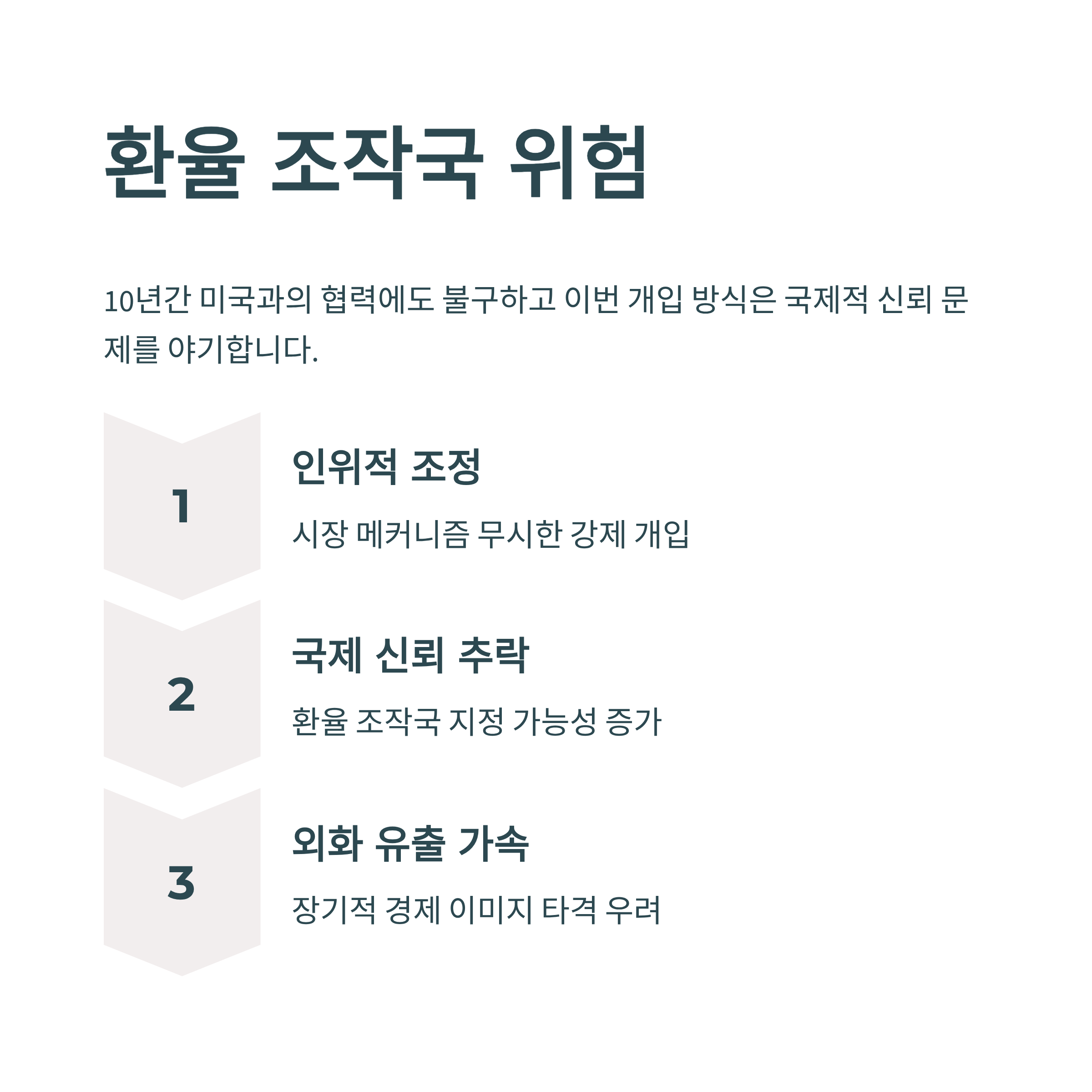 더구나 지난 10년간 환율 안정화를 위해 미국과의 긴밀한 협력이 지속되어 왔지만, 이번 개입 방식은 우리나라가 '환율 조작국'으로 지정되는 국제적 신뢰성 문제를 야기할 가능성을 높이고 있다. 이는 한국 경제에 장기적인 부정적인 이미지와 함께 외화 유출을 가속화할 우려를 키운다.