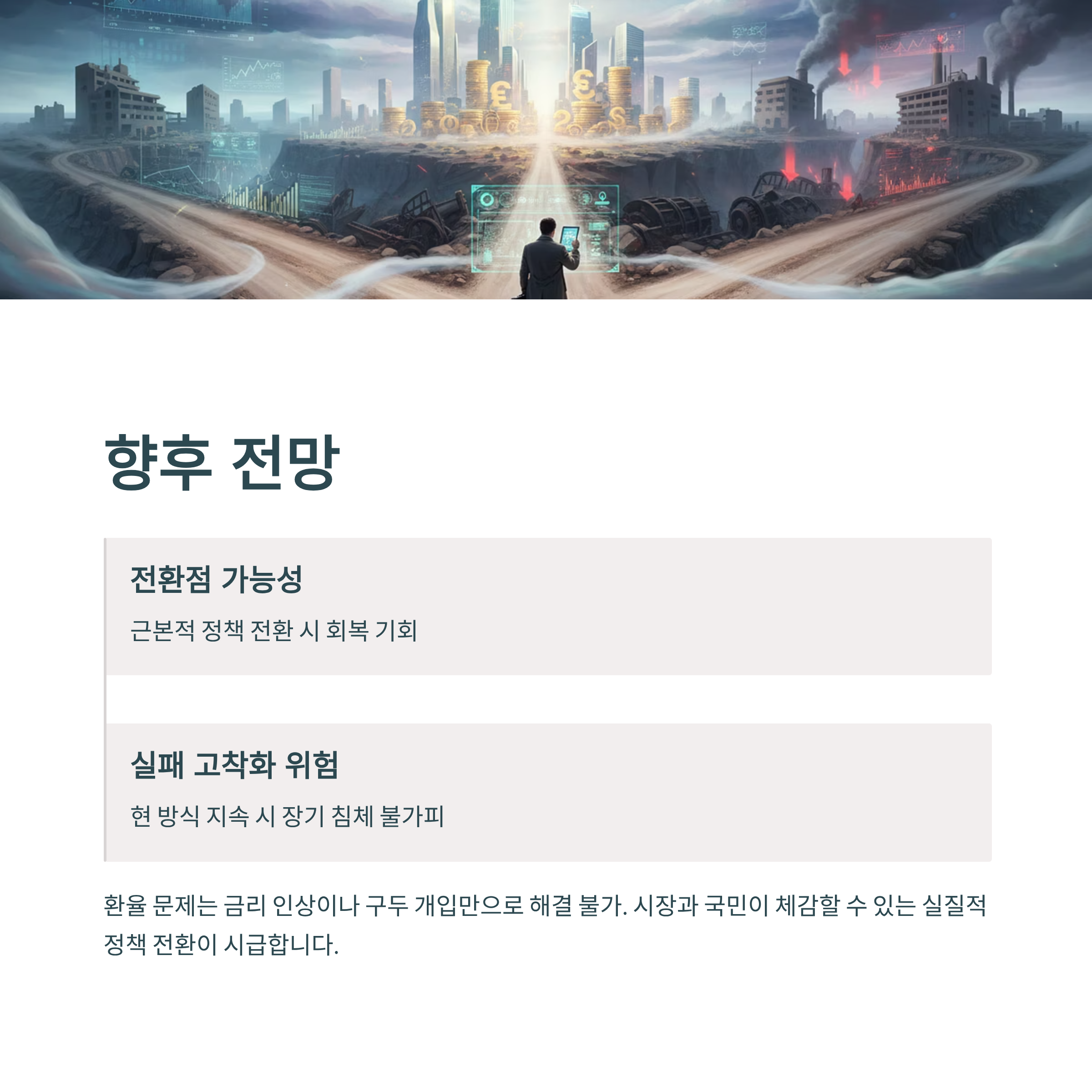 환율 문제는 단순히 금리 인상이나 구두 개입만으로 해결될 수 없다. 대신, 경제 펀더멘털을 탄탄히 하고 국제적 신뢰를 회복하는 데 초점을 맞춰야 한다. 시장은 물론, 국민들이 정책의 실효성을 체감할 수 있는 방향으로의 전환이 필요하다. 향후 환율이 정부의 전환점이 될지, 정책 실패의 상징으로 남을지는 더 지켜봐야 할 문제다.