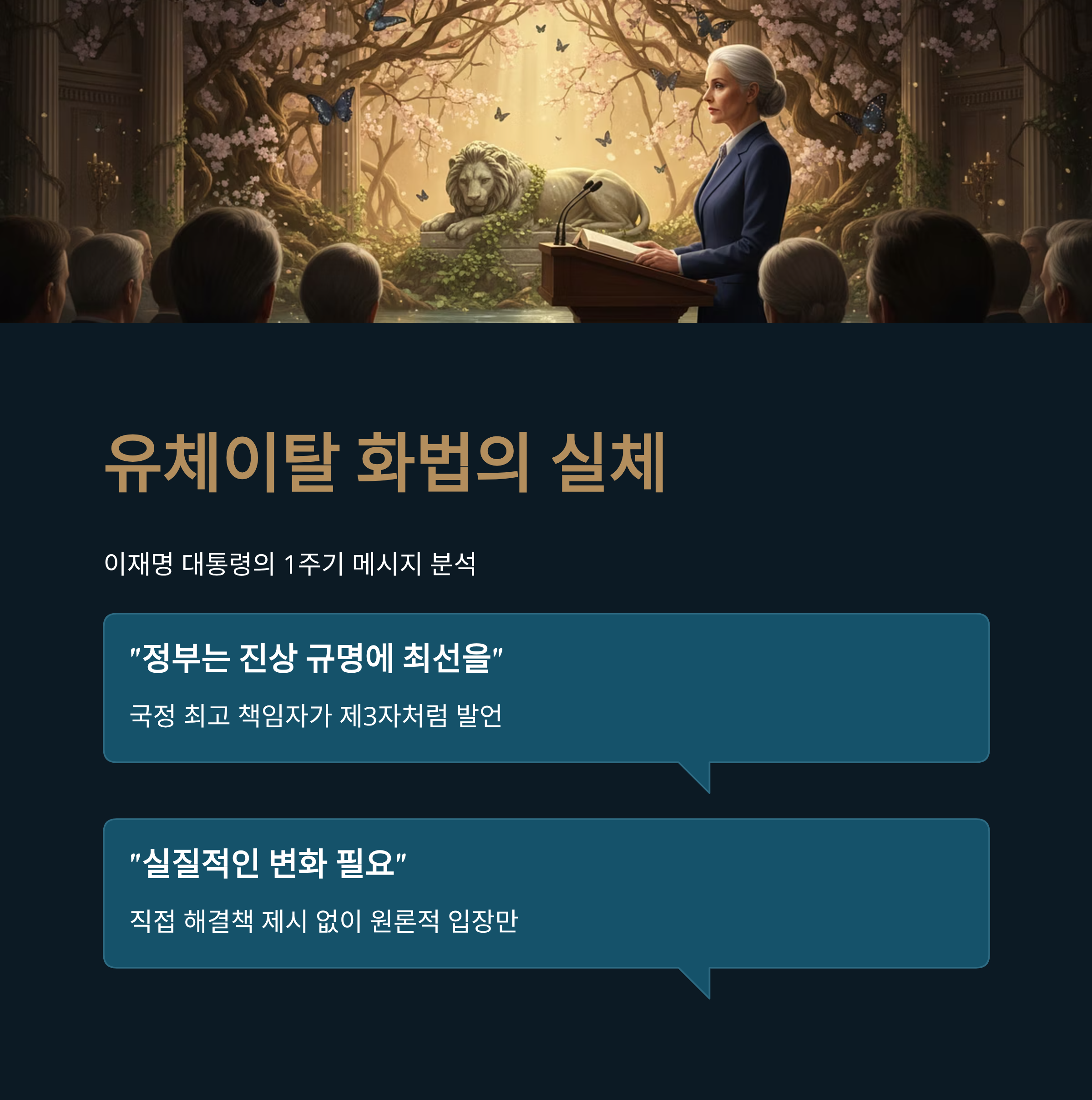 | Q1. 이재명 대통령의 1주기 메시지가 비판받는 주된 이유는 무엇인가요? |