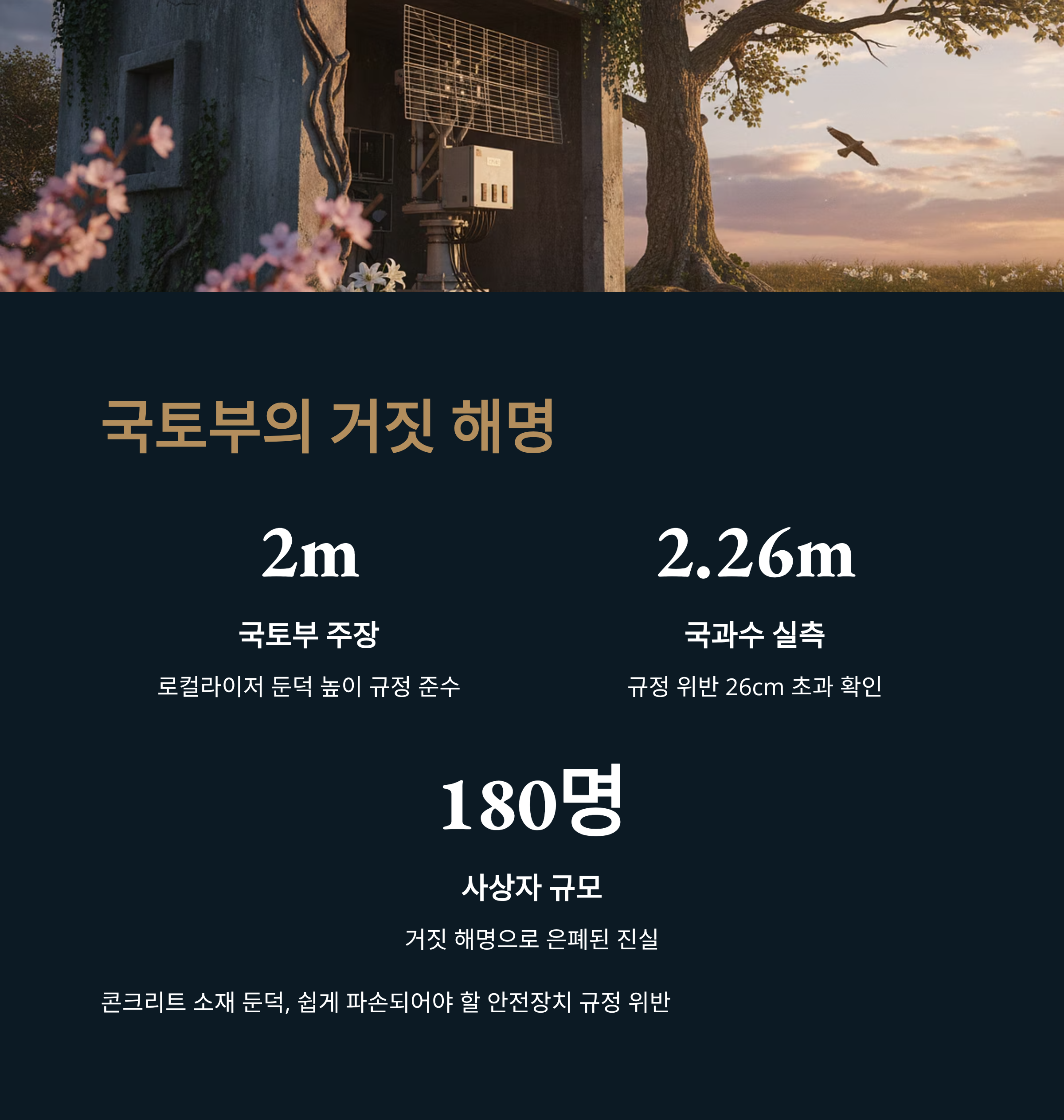 - 국토부의 거짓 해명 입증: 국토교통부는 사고 원인이 된 '로컬라이저 둔덕' 높이를 2m라고 주장했으나, 국과수 실측 결과 규정을 위반한 2.26m로 밝혀져 거짓 해명 논란이 불거졌습니다.