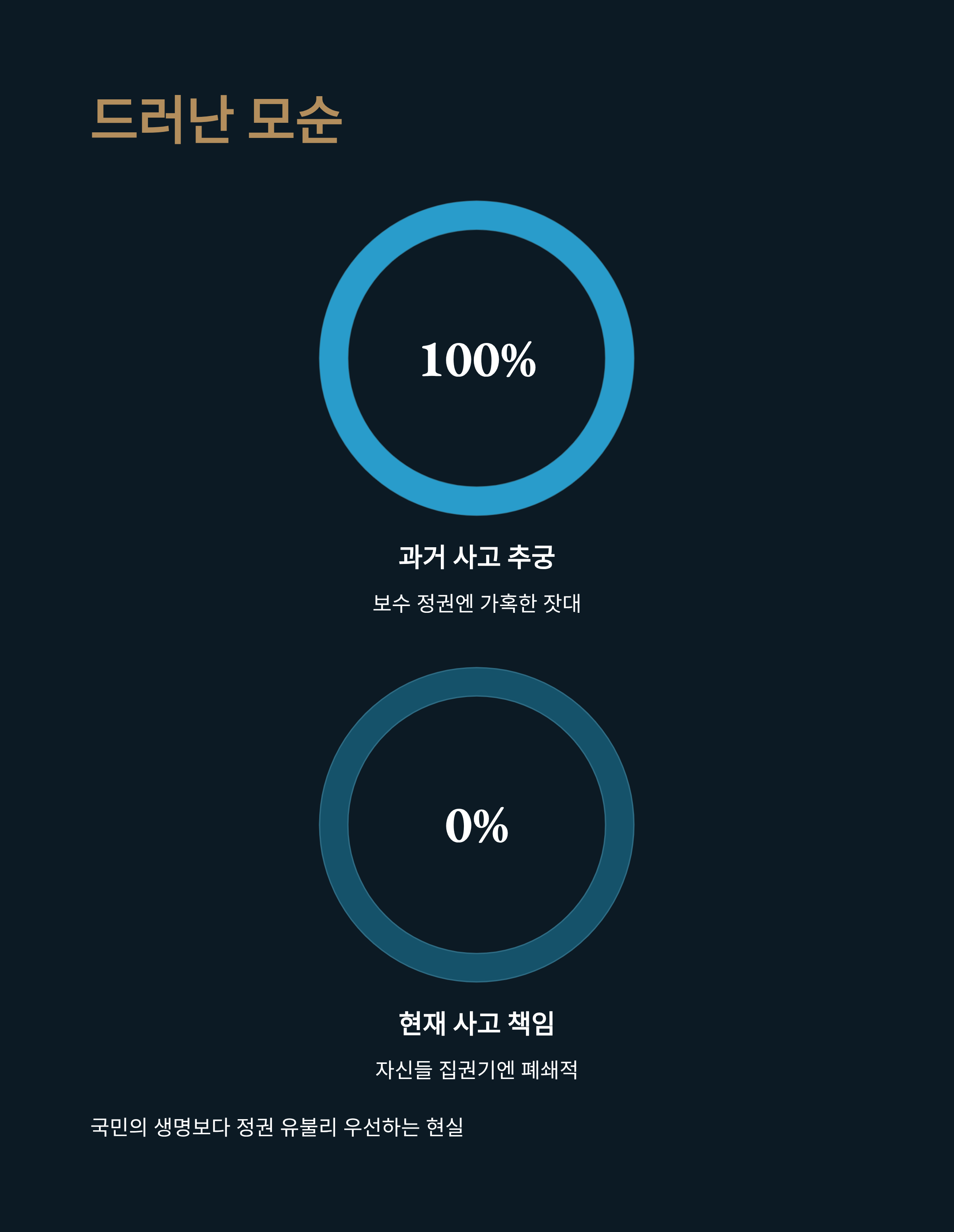 무안 공항 사고 1주기를 맞아 드러난 이재명 정부의 민낯은 충격적입니다. 국과수의 조사로 밝혀진 국토부의 거짓말, 대통령의 책임 회피성 발언, 그리고 유가족을 외면하는 깜깜이 조사는 현 정권이 외치던 '사람 사는 세상'이나 '안전한 대한민국'과는 거리가 멉니다. 특히 과거 보수 정권의 사고에는 가혹하리만큼 엄격한 잣대를 들이대던 민주당과 그 지지자들이, 호남 지역에서 발생한 이번 참사에 대해서는 침묵으로 일관하는 것은 명백한 이중잣대이자 선택적 정의입니다.