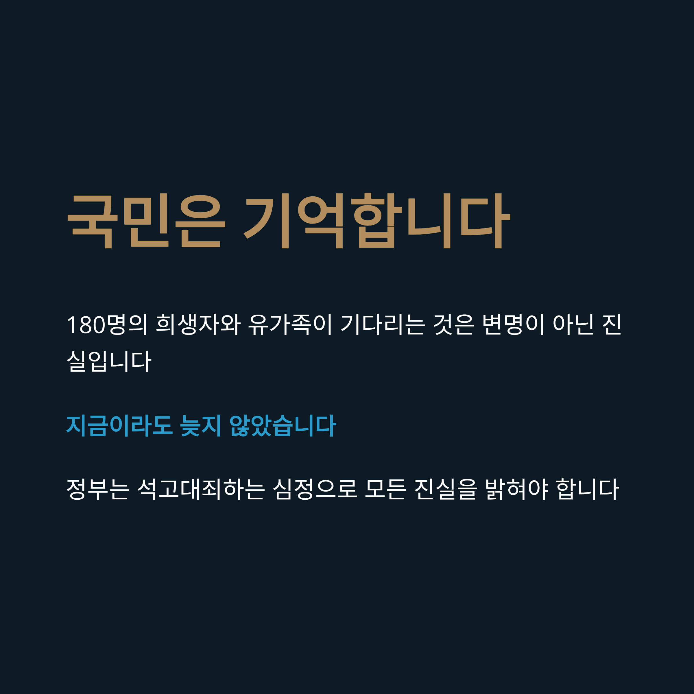 유가족들이 요구하는 것은 엔진 결함 여부 확인과 조사 보고서 원문의 공개입니다. 하지만 조사위는 '국제 관례'와 '영업 비밀'이라는 핑계로 1년이 지난 시점까지도 자료 공개를 거부하고 있습니다. 과거 이태원 사고나 세월호 사고 당시, 작은 의혹이라도 있으면 모든 자료를 공개하라고 압박했던 민주당 진영이 정작 자신들의 집권 시기에 발생한 사고에 대해서는 철저하게 폐쇄적인 태도를 보이는 것입니다. 조사 기구를 국무총리실 산하로 이관하는 법안조차 1주기를 코앞에 둔 시점에서야 늑장 통과된 것은 이들이 진상 규명에 얼마나 소극적인지를 여실히 보여줍니다.