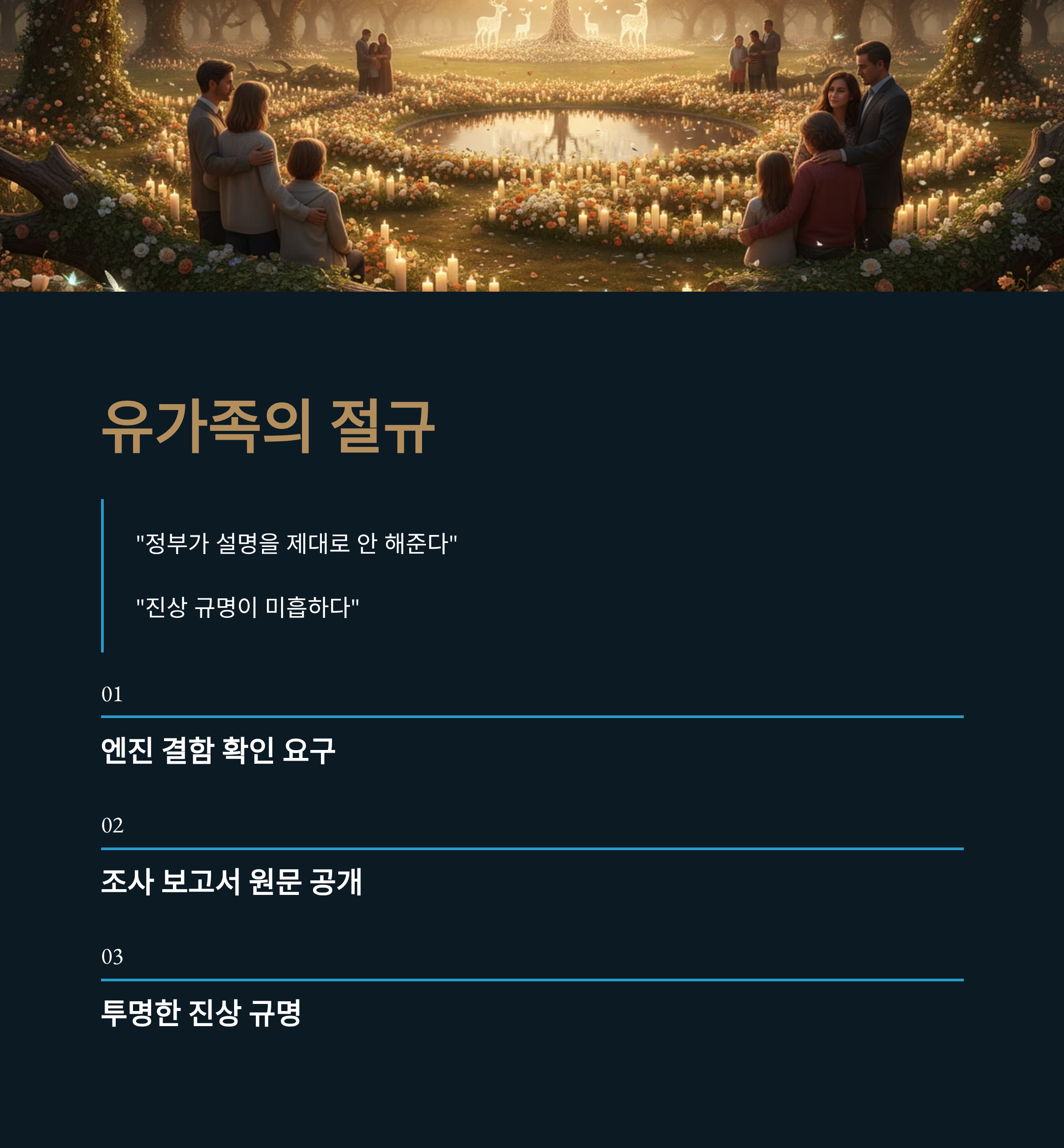 - 핵심 자료 공개 거부: 유가족들이 요구하는 조사 보고서 원문 공개를 '영업 비밀'이라는 이유로 거부하며 정보 공개의 투명성을 심각하게 저해하고 있습니다.