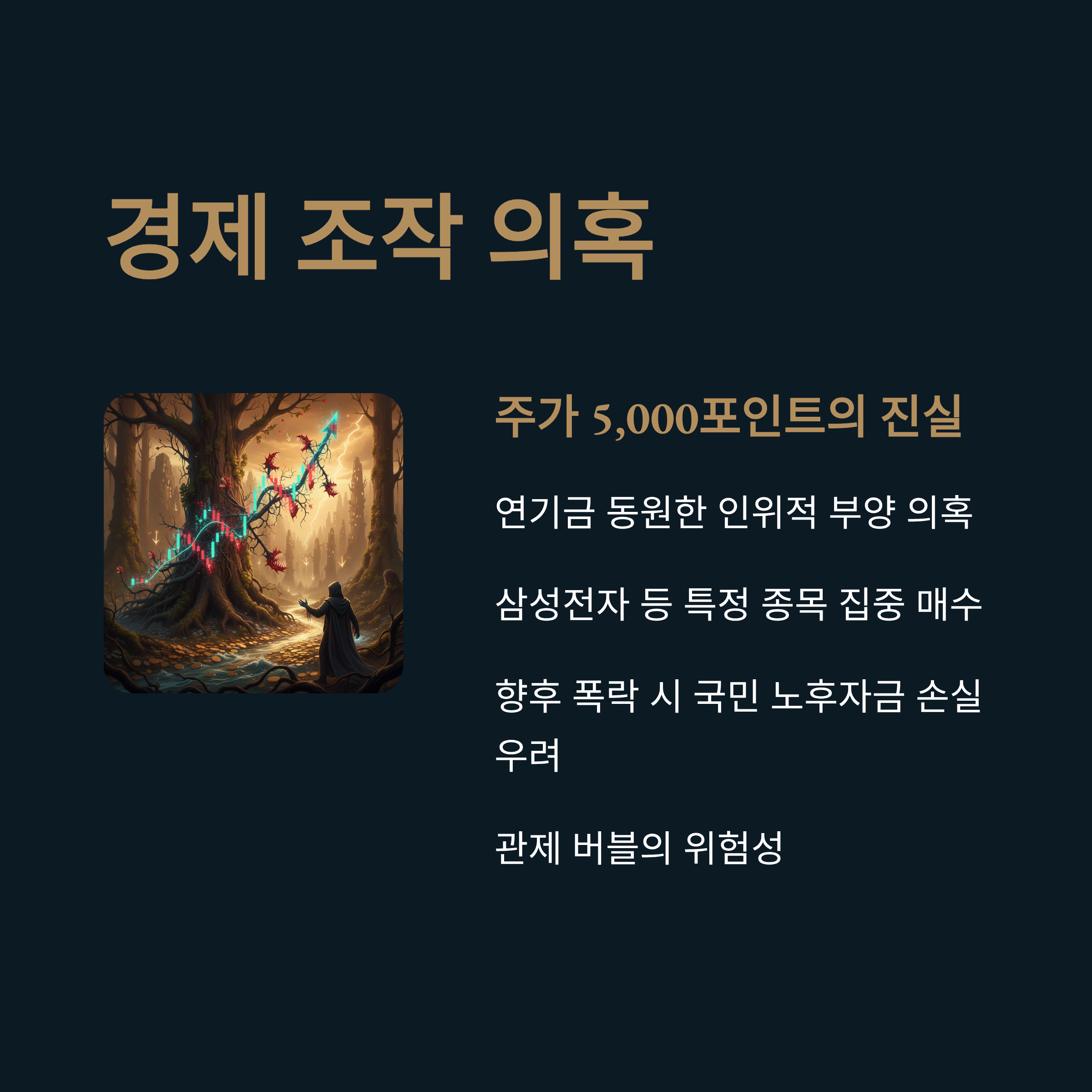 경제 불안감 확산: 주가 5,000포인트 달성이 연기금을 동원한 인위적 부양이라는 의혹을 낳고 있으며, 이는 향후 경제 폭락의 뇌관이 될 수 있다는 우려를 증폭시키고 있습니다.