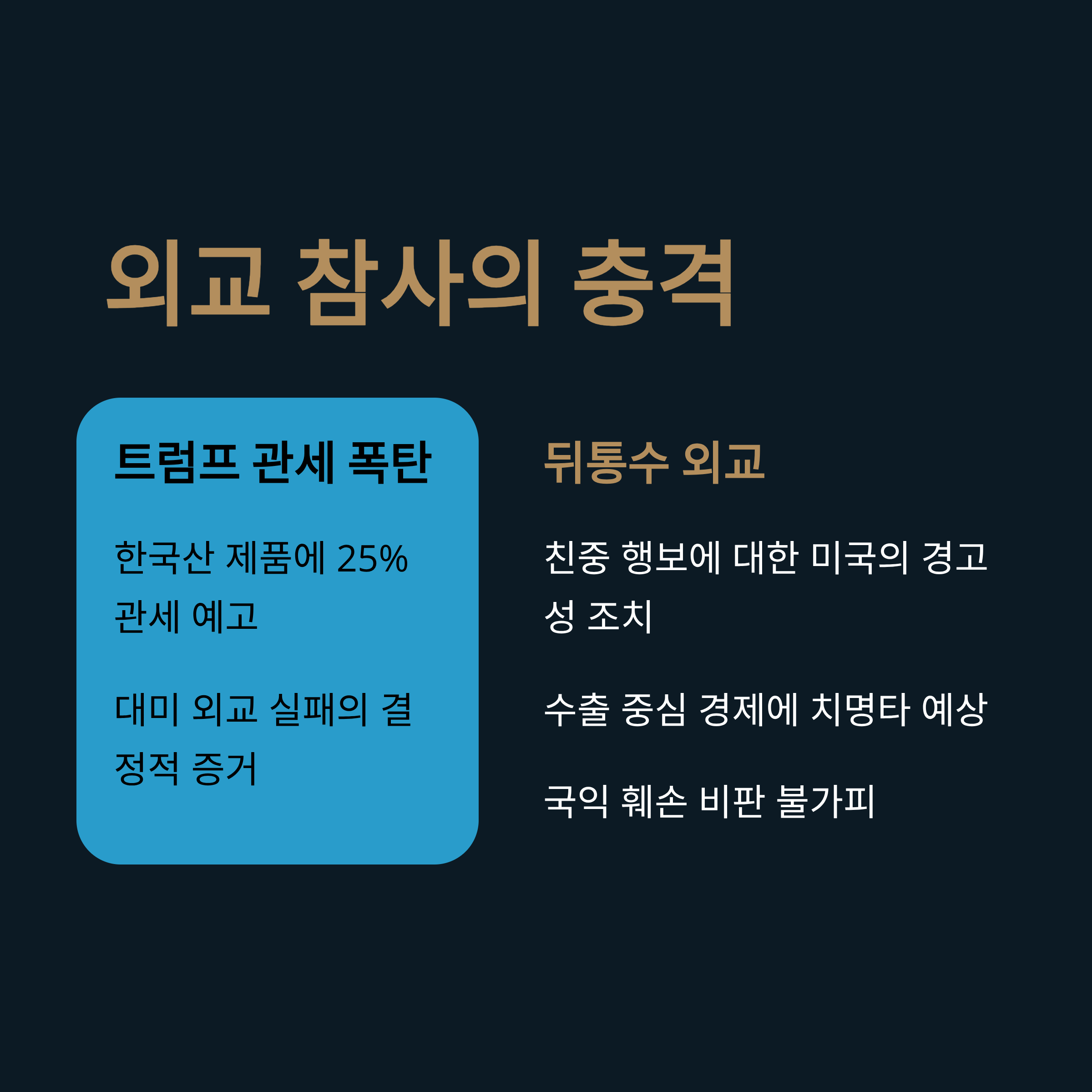 지지율 하락의 가장 큰 대외적 요인은 대미 외교의 실패입니다. 미국 트럼프 행정부가 한국산 자동차, 의약품 등에 대해 25%의 관세를 부과하겠다고 발표한 것은 이재명 정부의 외교적 무능을 적나라하게 보여주는 사례입니다. '친중 행보'에 대한 미국의 경고성 조치로 해석되는 이번 관세 폭탄은 수출 중심의 한국 경제에 치명타를 입힐 것으로 보입니다. 정부는 그동안 외교적 성과를 자화자찬해 왔으나, 실제로는 미국으로부터 '뒤통수'를 맞으며 국익을 심각하게 훼손하고 있다는 비판을 피하기 어렵습니다.