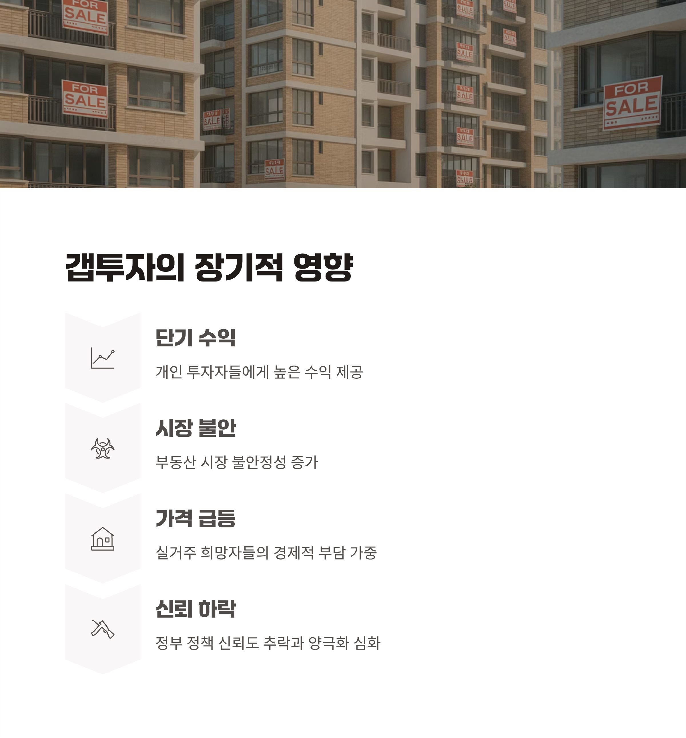 갭투자는 단기적으로 개인 투자자들에게는 높은 수익을 제공할 수 있지만, 장기적으로는 부동산 시장 불안을 초래할 수 있습니다. 갭투자에 의해 가격이 급등하면 실거주를 원하는 국민들은 큰 경제적 부담을 겪게 됩니다. 이를 방치할 경우, 정부 정책에 대한 신뢰 하락과 함께 사회적 양극화 문제가 심화될 가능성이 큽니다.