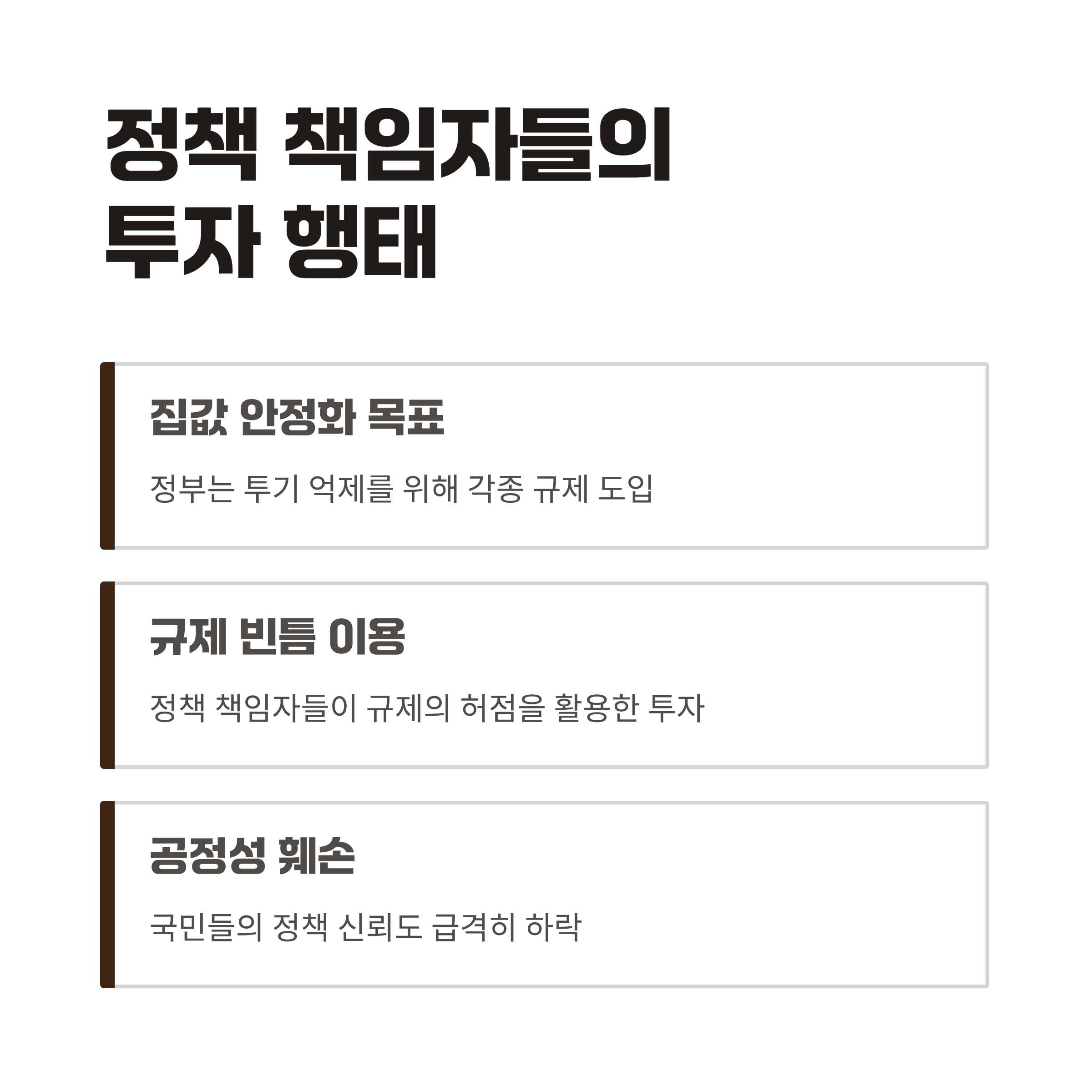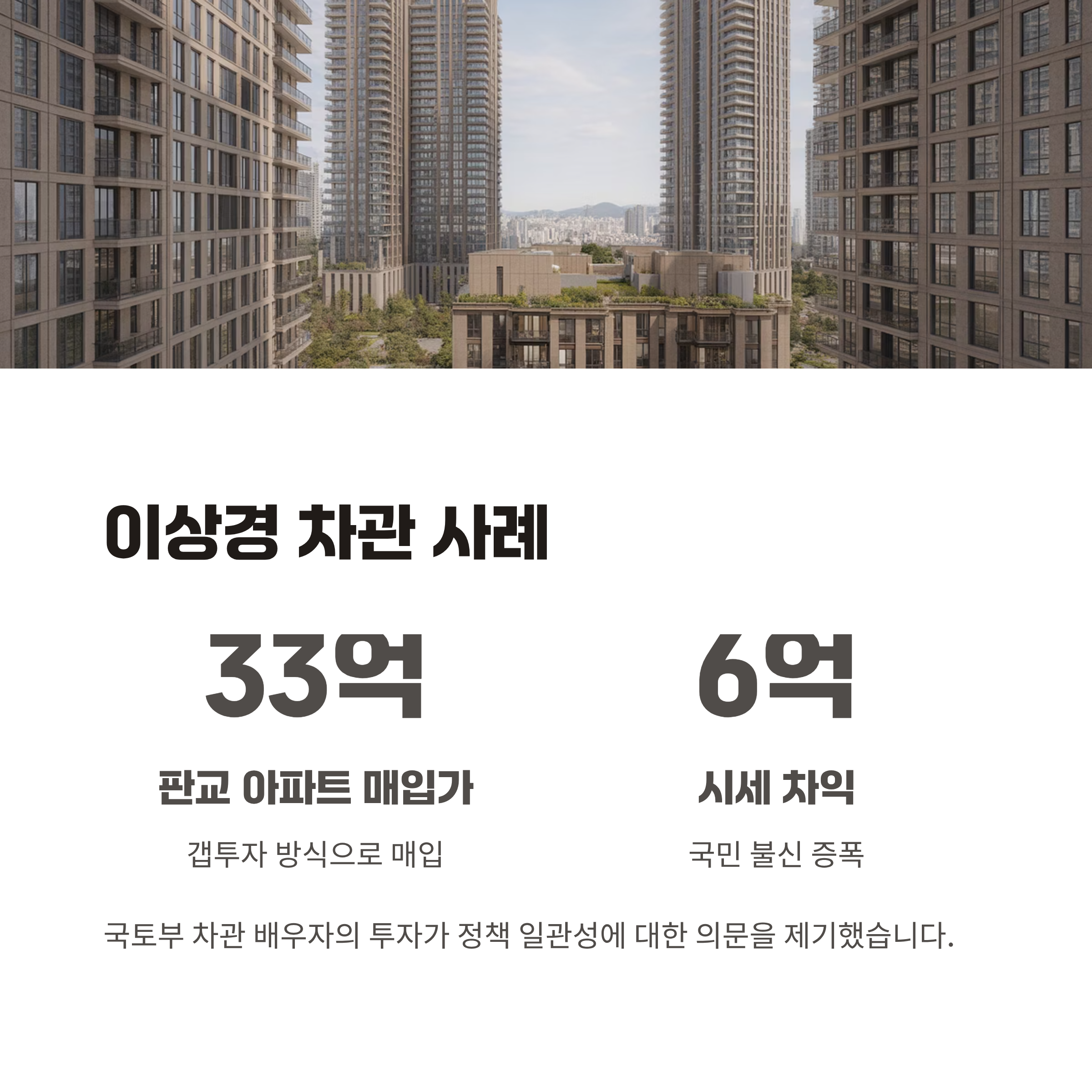 특히 이상경 국토부 차관 배우자가 판교 지역에서 약 33억 원 규모의 아파트를 갭투자 방식으로 매입했고, 약 6억 원의 시세 차익을 얻은 것으로 드러났습니다. 이 사례는 국민들에게 '공정성'과 '정책 일관성'에 대한 불신을 키웠습니다. 정부는 집값 안정화와 투기 억제를 목표로 내세우며 각종 규제를 도입했지만, 정작 정책 책임자들이 규제의 빈틈을 이용한 행태는 심각한 자성의 필요성을 보여줍니다.