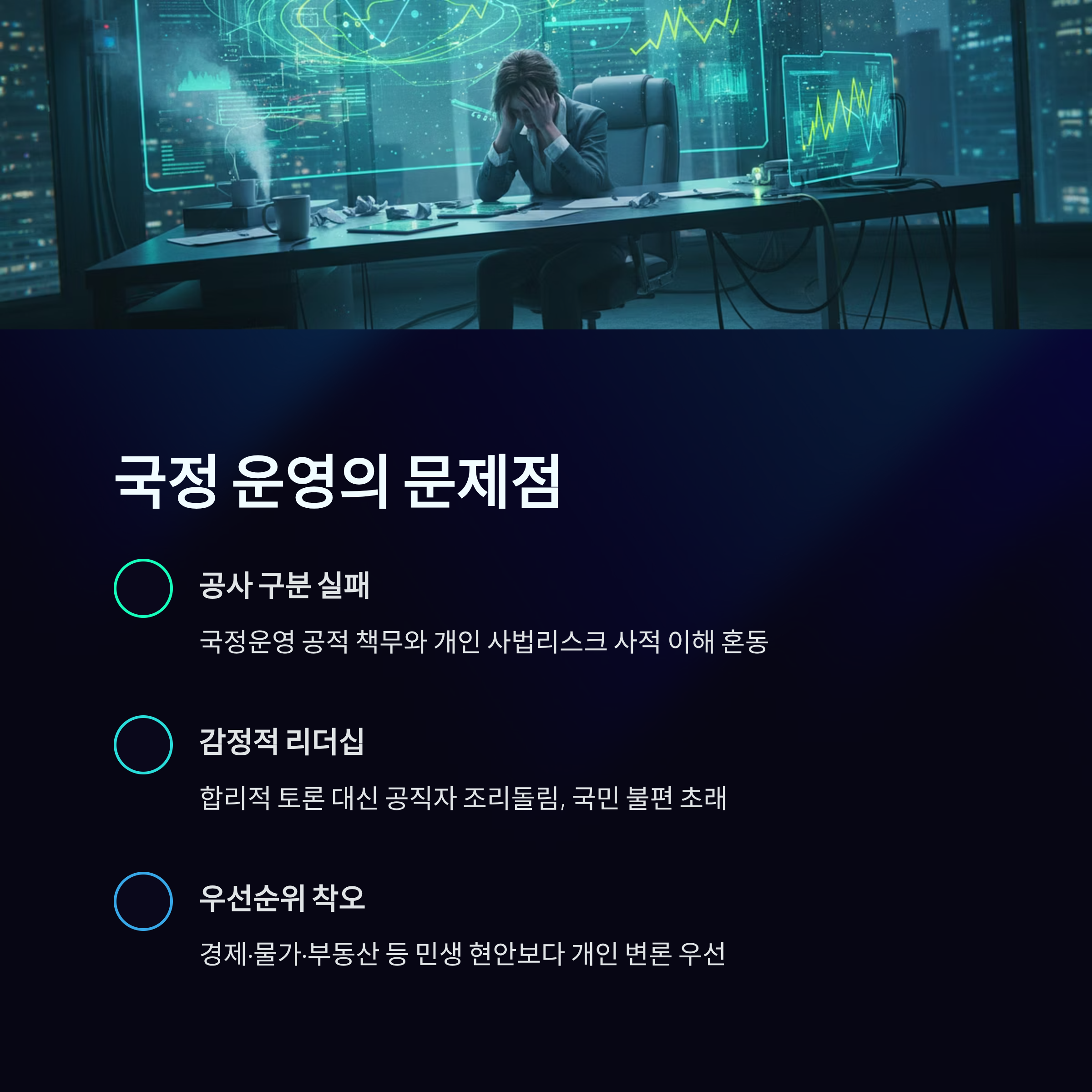 국가 정책을 위한 합리적 토론 대신, 개인의 목적을 위해 공직자를 조리돌림하고 국민 불편을 초래하는 지시를 내리는 모습은 대통령의 자질을 의심케 하는 대목이며, 국정 운영이 리더의 감정에 따라 좌우될 수 있다는 심각한 우려를 낳고 있습니다.