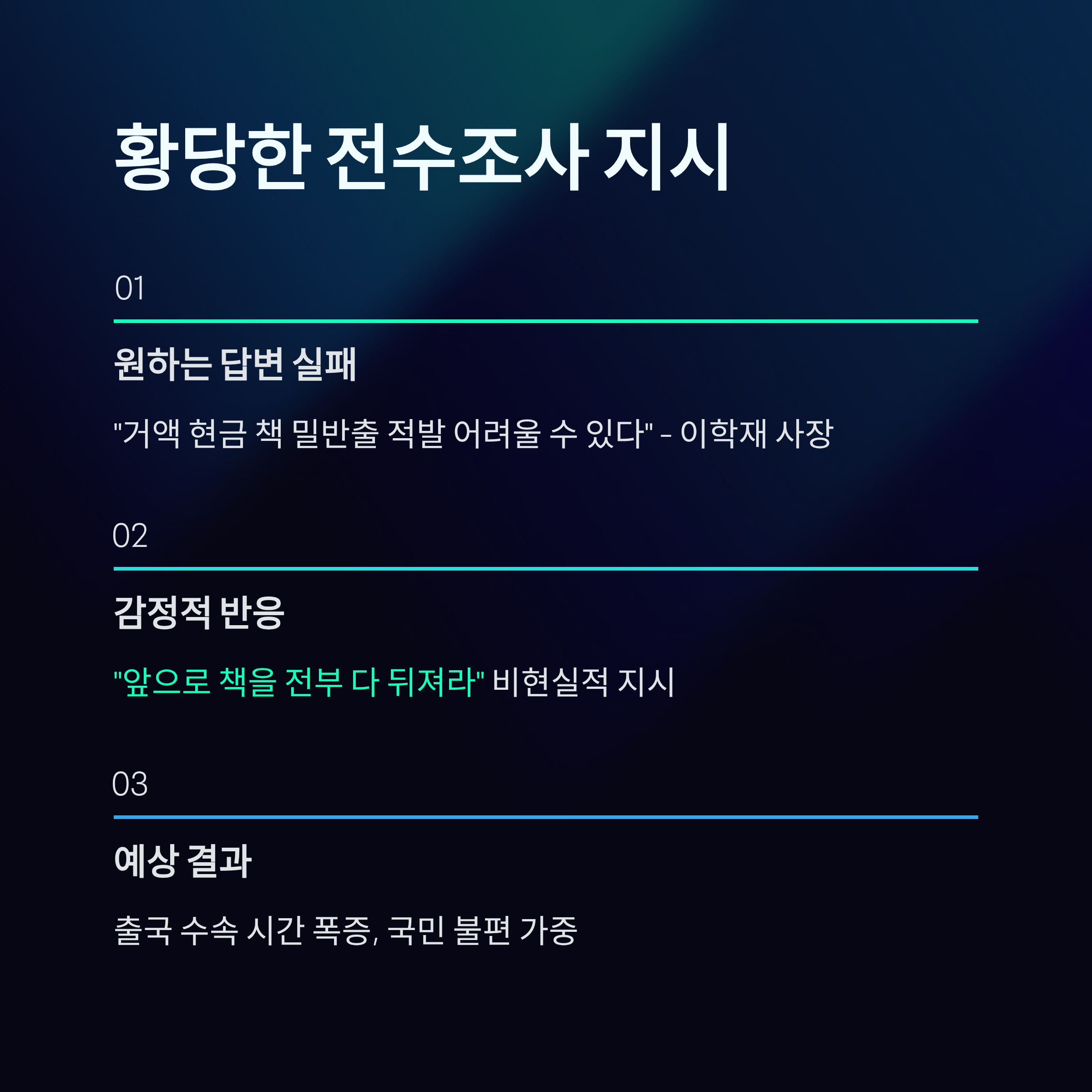 | A: 모든 출국객의 책을 일일이 검사하게 되면 출국 대기 시간이 엄청나게 길어져 국민들이 큰 불편을 겪게 됩니다. 또한, 이는 현실성이 떨어지는 감정적인 지시라는 비판이 많으며, 대통령이 개인적인 불만으로 비현실적인 정책을 지시할 수 있다는 우려를 낳습니다. |