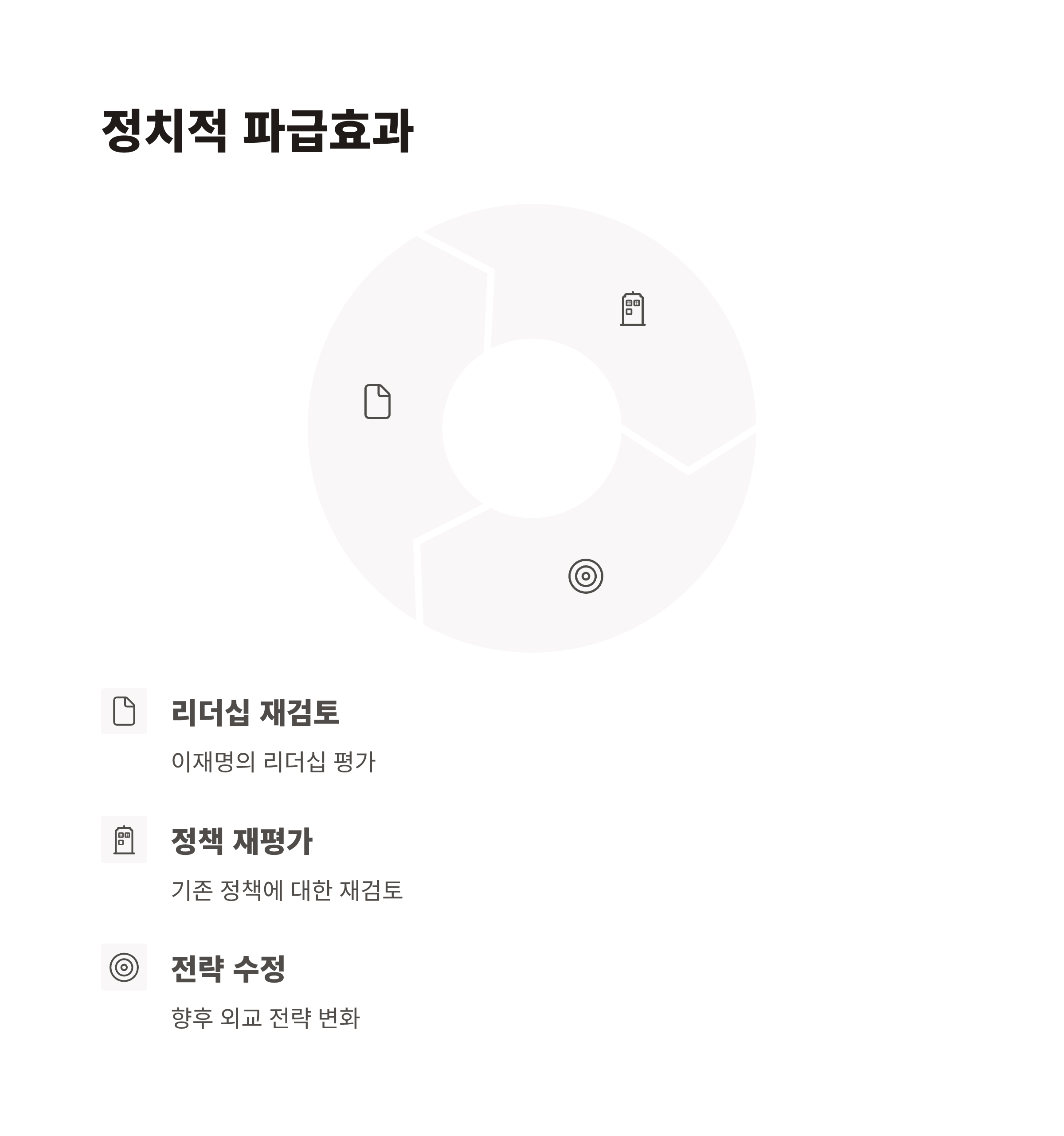 5. 이로 인해 향후 국내 정치와 외교 전략에서 이재명의 리더십 및 정책에 대한 재검토가 필요할 전망입니다.