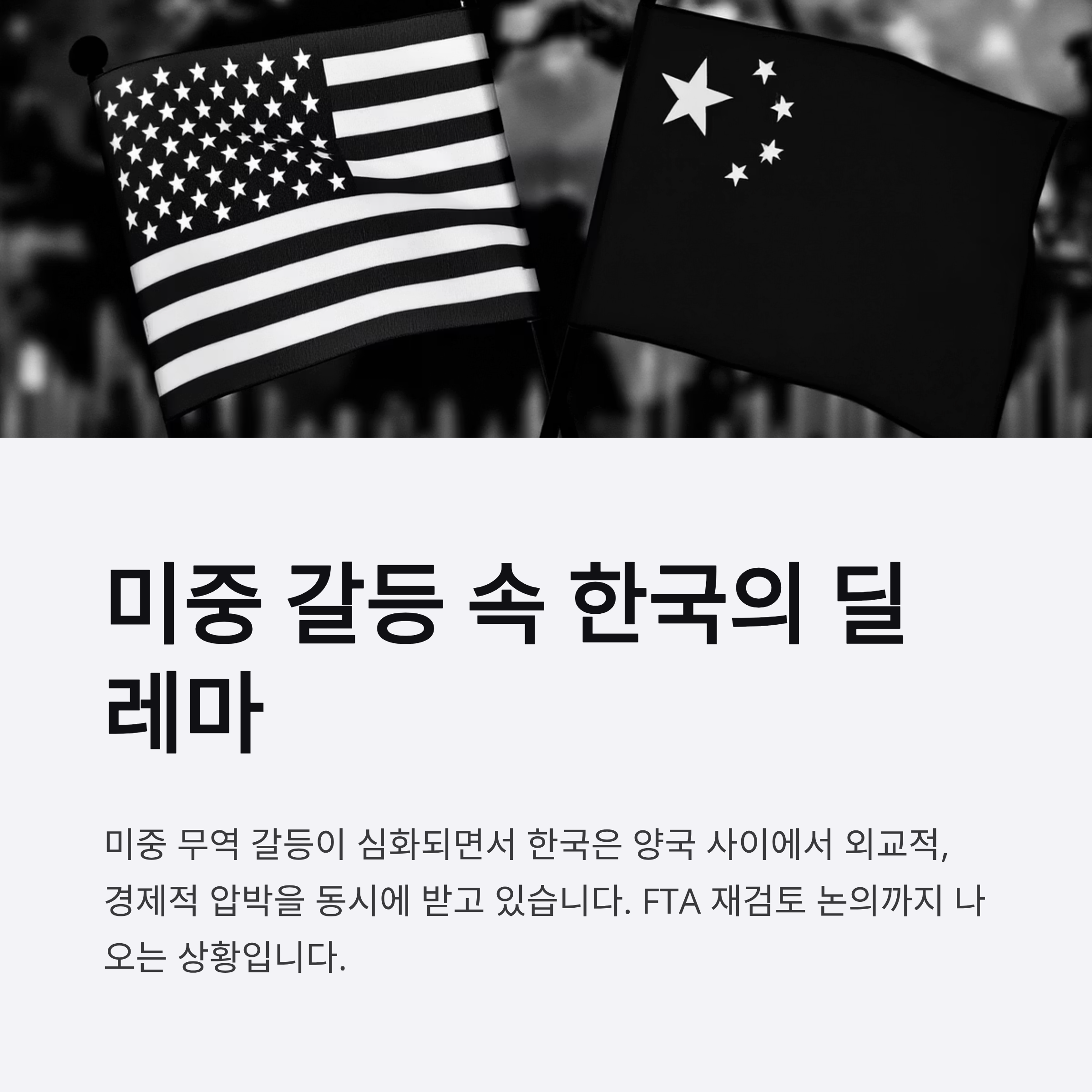 미중 무역 갈등이 심화되면서, 한국은 경제와 외교적 압박을 동시에 받는 어려운 상황에 놓여 있습니다. 미국은 자국 산업 보호를 이유로 한국 제품에 관세를 부과하며 추가적인 투자 이행을 요구하고 있습니다. 이와 같은 조치로 한국 경제의 대미 무역 의존도가 낮아질 것이라는 우려가 제기되고 있습니다. 특히 반도체, 자동차 산업에서 미국의 관세 정책은 한국 주요 기업들에게 타격을 주고 있습니다.