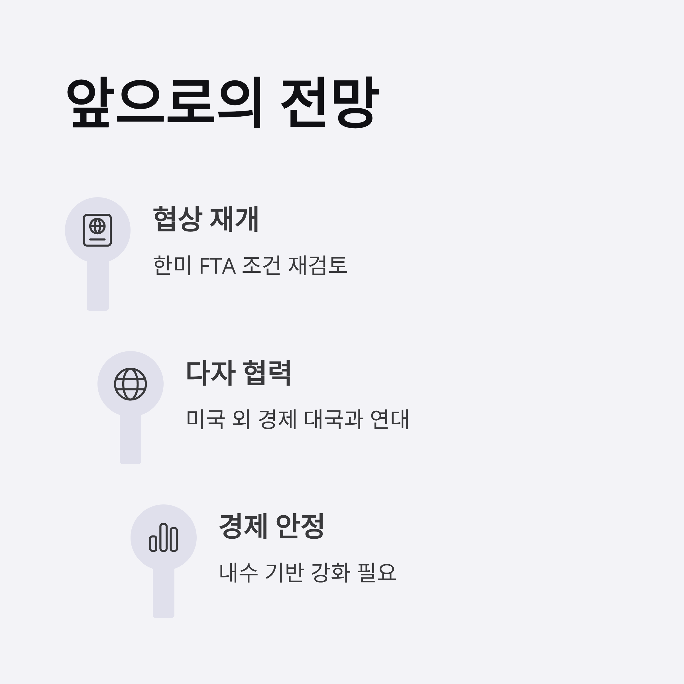 미국과 한국 간 협상은 단기적으로는 갈등 조정이 어렵다는 평가를 받고 있습니다. 전문가들은 한미 자유무역협정(FTA)을 재검토하거나 새로운 조건을 설계해야 한다고 주장합니다. 그러나 이러한 논의는 오히려 갈등을 심화시키는 요소로 작용할 가능성도 다분합니다. 한국 정부는 실용적인 대안을 모색하면서도 미국의 압박에 대해 강경한 메시지를 전달할 필요가 있습니다.