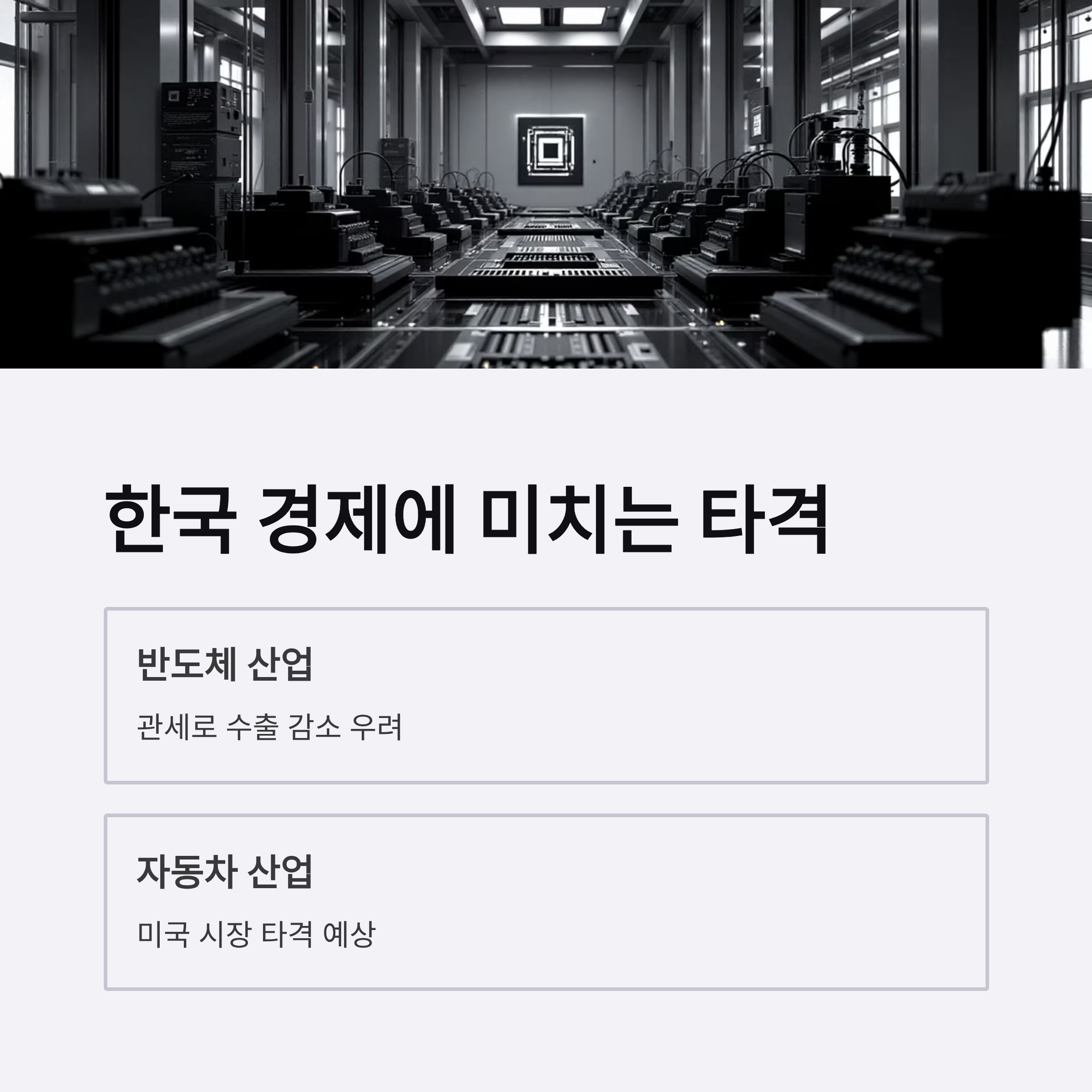 | A. 자동차, 반도체 산업 등 주요 수출 품목에 대한 관세 부과는 기업 이익 감소와 대미 수출 의존도 약화로 이어질 수 있습니다. 따라서 투자 환경의 변화와 내부 대책 마련이 필요합니다. |