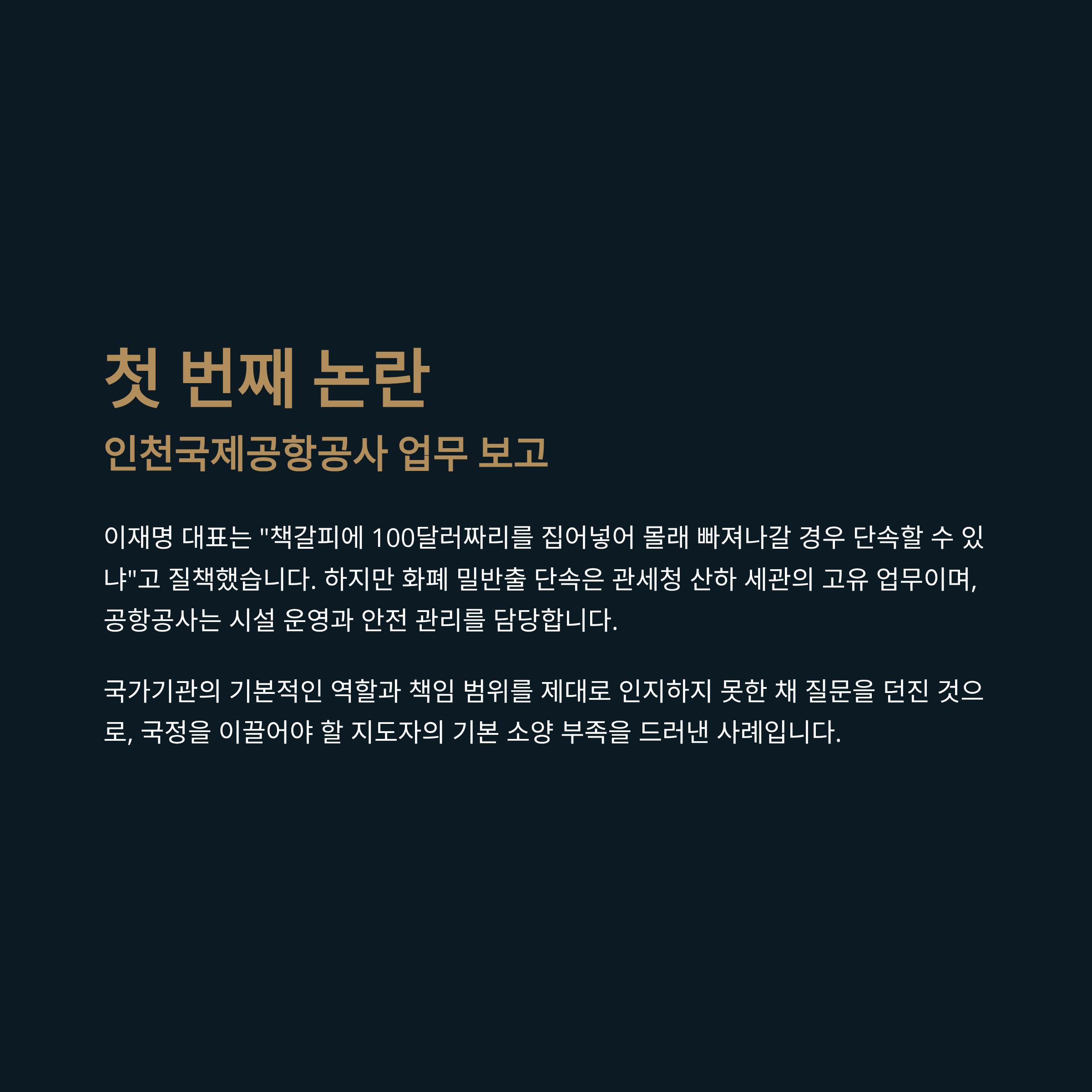 최근 이재명 대표가 국정 관련 업무 보고를 받는 과정에서 보인 발언과 태도가 연일 도마 위에 오르고 있습니다. 그는 인천국제공항공사와 동북아역사재단 업무 보고에서 자신의 지식을 과시하려는 듯한 질문을 던지거나, 해당 기관의 소관 업무를 제대로 파악하지 못한 채 기관장을 압박하는 모습을 보였습니다. 이로 인해 '얄팍한 지식으로 망신을 당했다', '대통령의 자질이 의심된다'는 등 날 선 비판이 쏟아지고 있습니다. 본 글에서는 인천국제공항공사와 동북아역사재단에서 벌어진 구체적인 논란을 분석하고, 이를 통해 드러난 이 대표의 리더십과 소통 방식의 문제점을 심도 있게 짚어보고자 합니다.