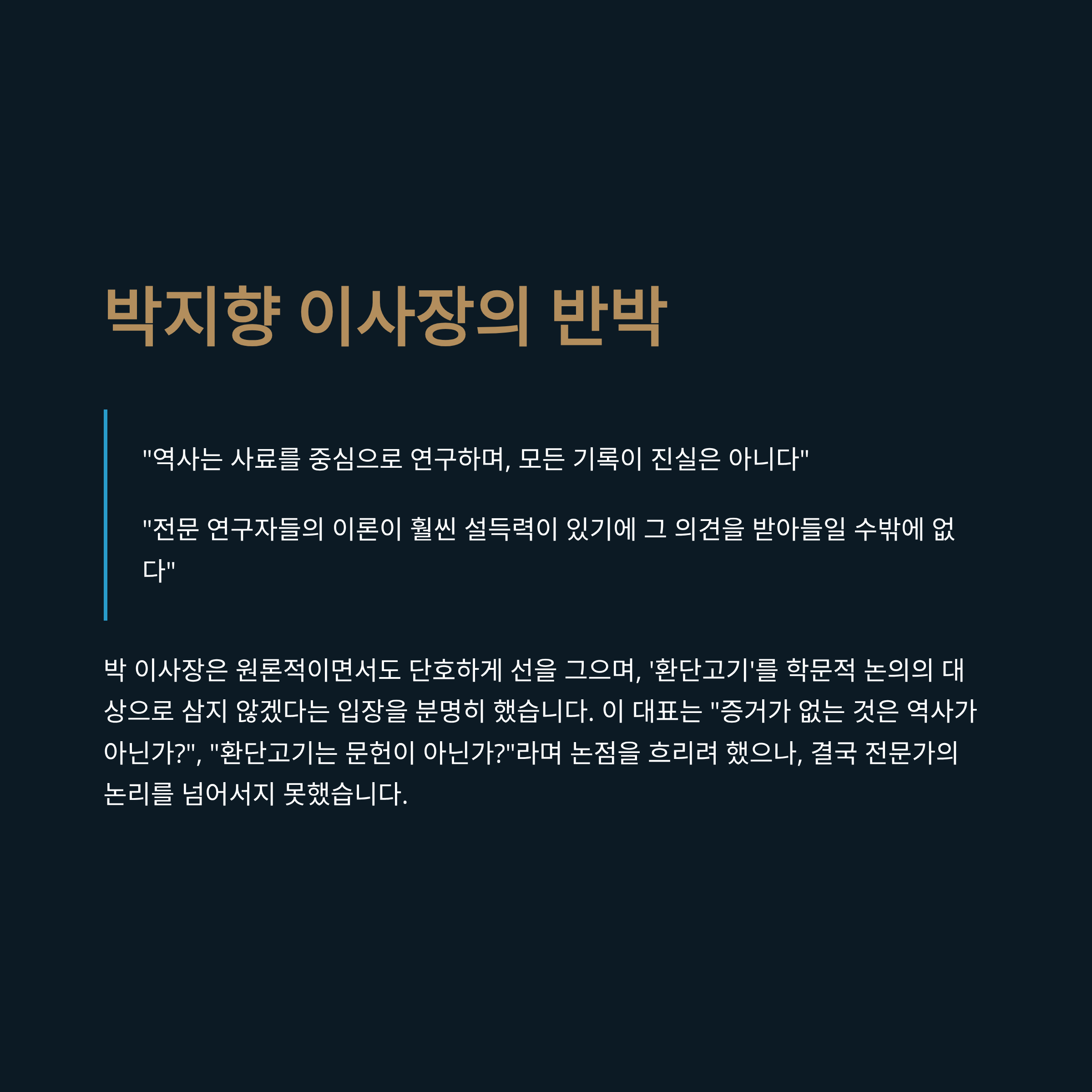 이 과정에서 이 대표는 "증거가 없는 것은 역사가 아닌가?", "환단고기는 문헌이 아닌가?"라며 논점을 흐리려 했으나, 결국 전문가의 논리를 넘어서지 못했습니다.