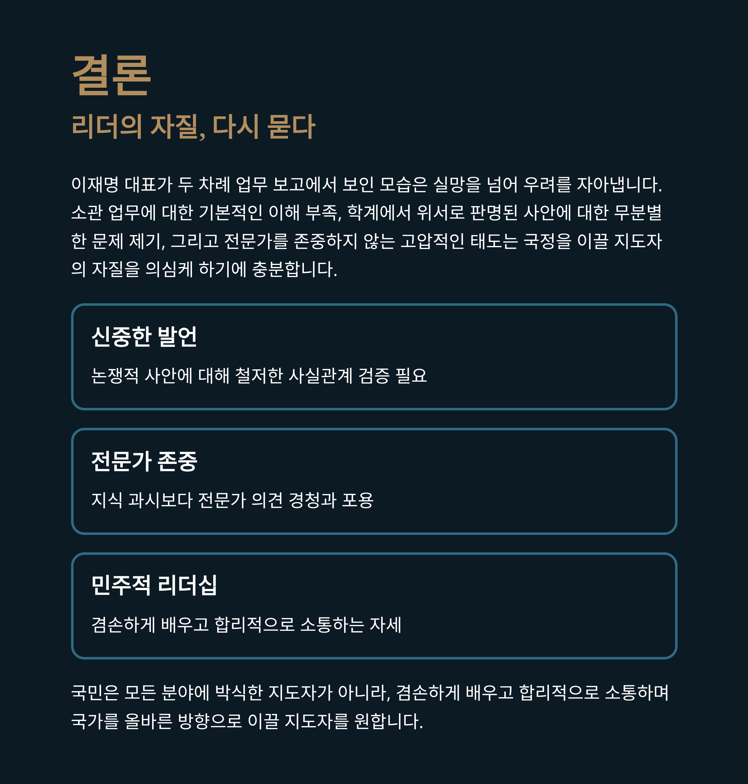 전문가를 존중하고 사실에 기반해 질문해야 할 자리에서, 조롱과 압박으로 일관한 태도는 리더의 품격과 거리가 멀다는 비판을 피할 수 없습니다.