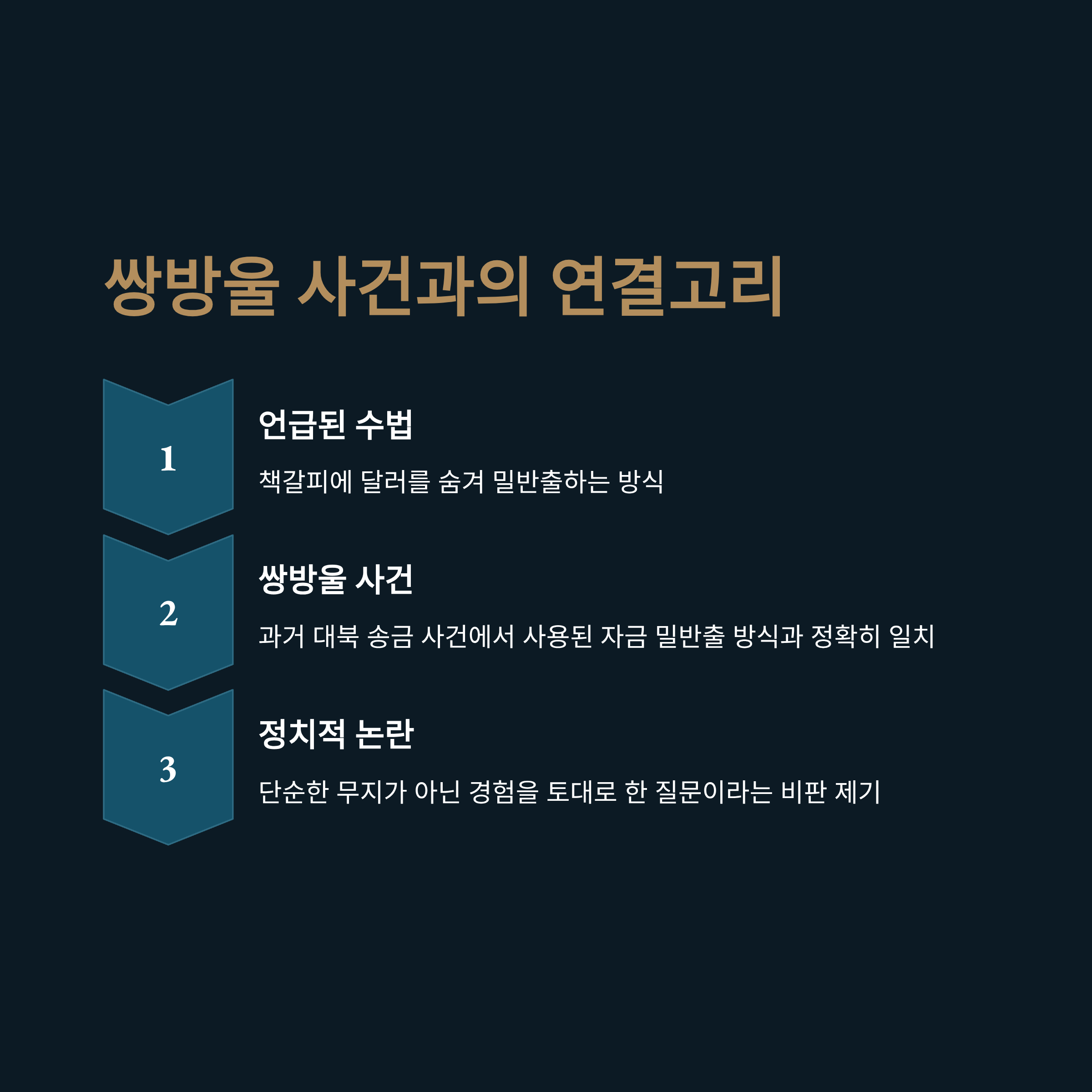 특히 언급한 '책 속 달러 은닉' 수법은 과거 쌍방울 대북 송금 사건과 유사하여 불필요한 정치적 의혹을 자초했습니다.