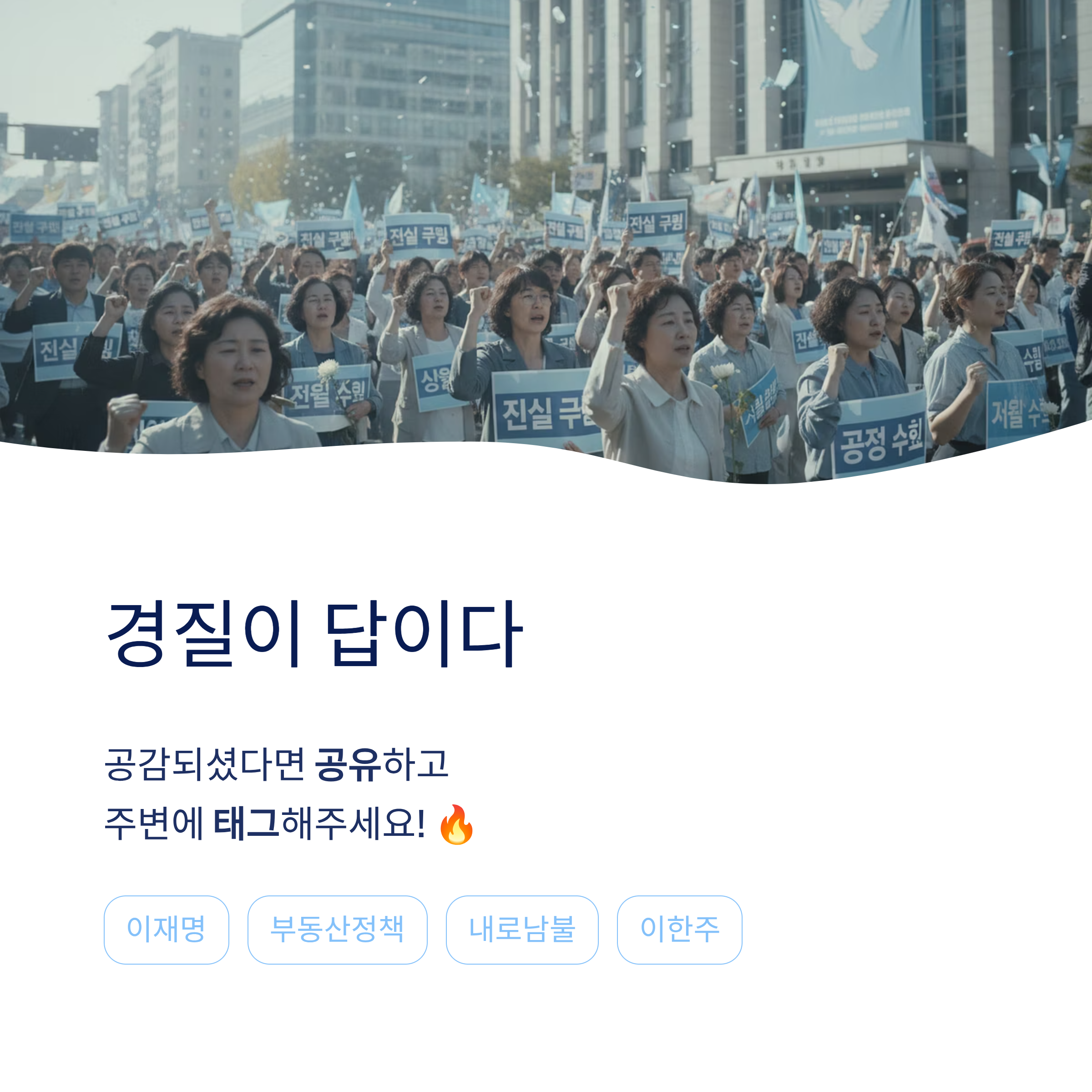 부동산 정책의 성패는 정부의 권위와 신뢰에 달려 있습니다. 이재명 대통령이 언급했듯, 권위를 잃은 정부는 식물 정부가 될 수밖에 없습니다. 그러나 현재 드러난 대통령의 1주택 고수와 핵심 측근 이한주의 막대한 부동산 보유는 정부 정책의 진정성을 송두리째 흔들고 있습니다. 국민에게는 매각을 강요하고 위험성을 경고하면서, 뒤로는 부동산으로 자산을 증식하는 이중적인 태도가 지속된다면 어떤 강력한 규제도 '약발'이 먹힐 리 만무합니다. 지금이라도 이재명 대통령은 본인의 분당 자택 문제를 결자해지하고, 이한주와 같은 내로남불 인사에 대한 엄정한 조치를 취해야 합니다. 말과 행동이 일치하지 않는 권력은 국민의 조롱거리가 될 뿐임을 명심해야 할 것입니다.