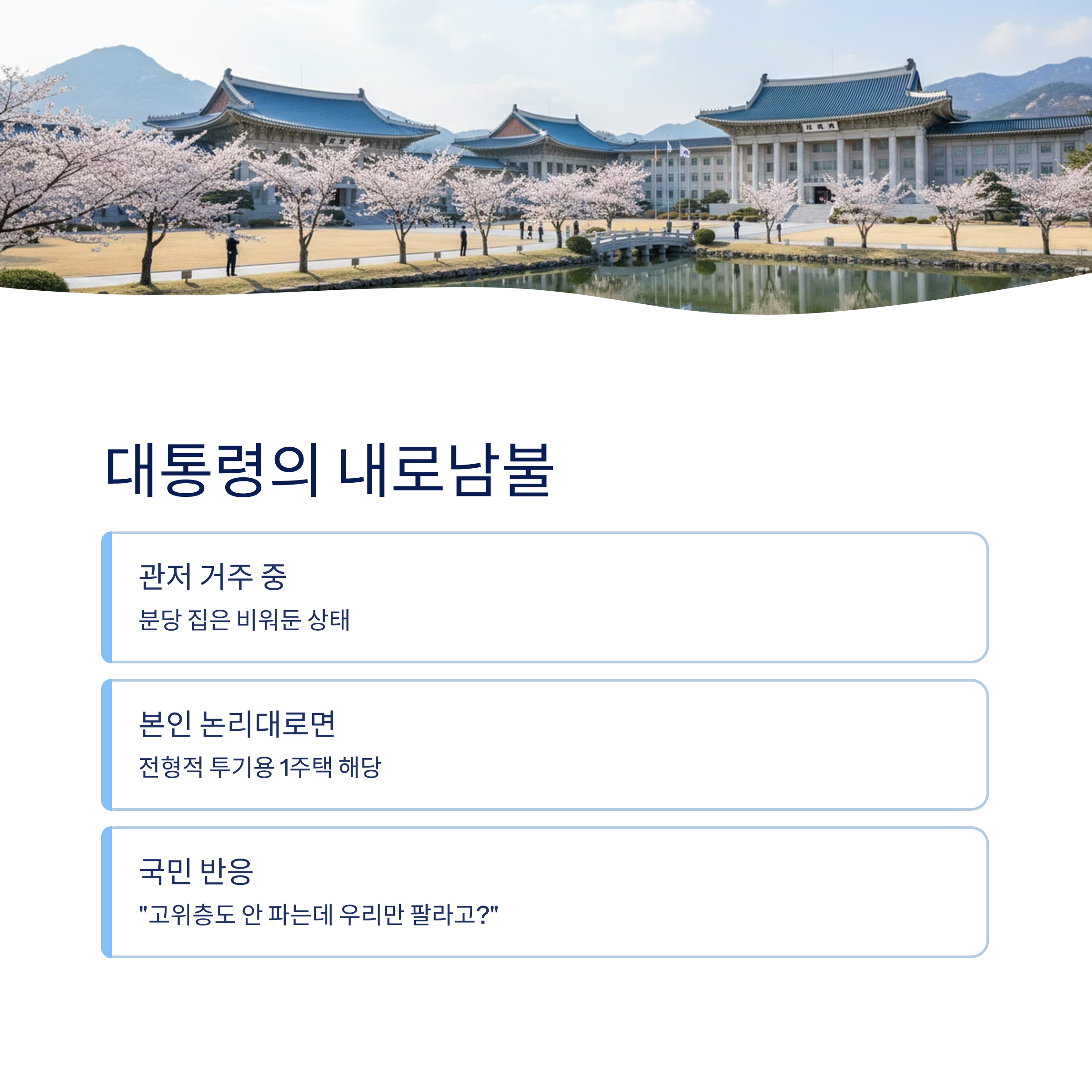 이재명 대통령은 투기용 1주택자의 매각을 주장하고 있으나, '투기용'을 가르는 객관적 기준이 부재하다는 비판이 쏟아지고 있습니다. 현실적으로 직장 발령, 자녀 교육, 노후 준비 등 실거주하지 못하는 사정은 다양합니다. 가장 큰 모순은 이 대통령 본인에게 있습니다. 현재 관저에 거주하며 분당 집을 비워두고 있는데, 본인의 논리대로라면 이는 전형적인 투기용 1주택에 해당합니다. 집값이 정점인 시기에 매각하여 솔선수범하는 대신 집을 유지하는 것은, 퇴임 후 더 큰 시세 차익을 기대하거나 해당 지역보다 좋은 입지를 찾기 어렵다는 판단 때문이라는 합리적 의심을 낳고 있습니다. 이는 국민들에게 "정부 고위층도 집을 안 파는데 우리만 팔라는 것이냐"는 저항감을 불러일으킵니다.
