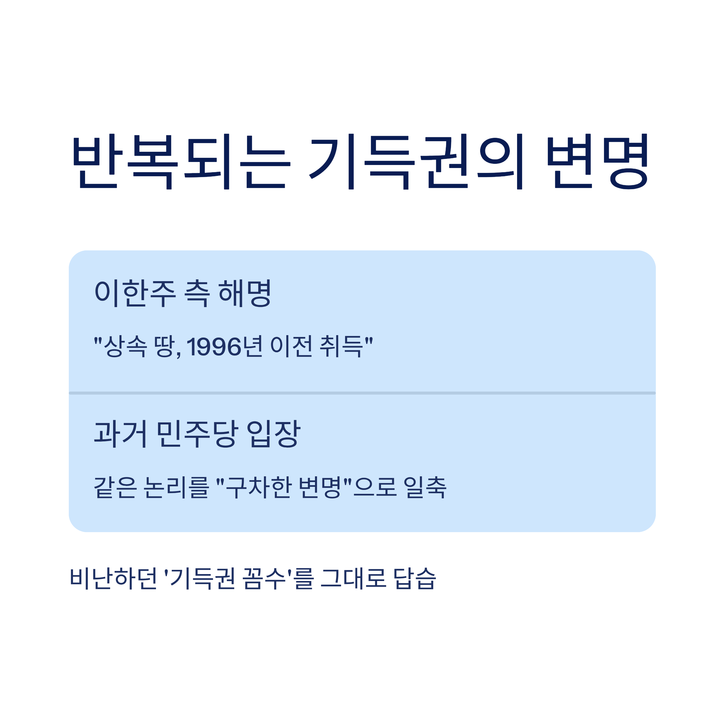 | A3. 그는 상속받은 땅이며 법 시행 이전 취득이라 법적 문제가 없다고 주장합니다. 하지만 이는 과거 민주당이 상대 진영을 공격할 때 용납하지 않았던 논리입니다. '경자유전' 원칙을 강조하는 현 정부의 기조와 맞지 않아 설득력이 떨어진다는 평이 지배적입니다. |
