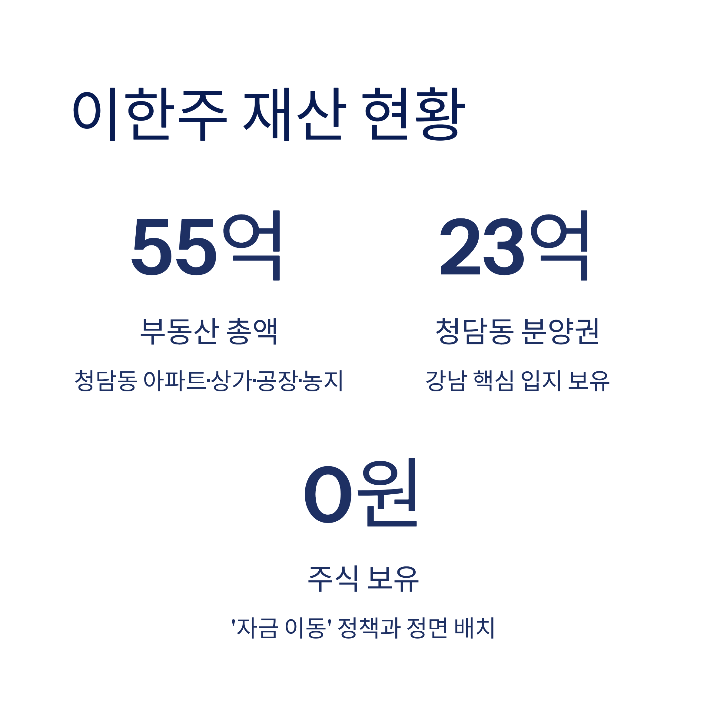 이재명 대통령의 경제 정책 설계자로 알려진 이한주의 재산 공개 내역은 충격적입니다. 그는 공개 대상 고위 공직자 120명 중 1위를 기록했으며, 신고 재산의 대부분이 부동산이었습니다. 특히 청담동 아파트 분양권(약 23억 원)을 포함해 상가, 공장 등 가족 명의로 총 55억 1,885만 원 상당의 부동산을 보유하고 있습니다. 그는 과거 간담회에서 "강남 집은 위험 자산"이라며 국민들에게 부동산 투자를 경계하라는 메시지를 냈습니다. 그러나 정작 본인은 '갭투자'나 다름없는 방식으로 강남 핵심 입지의 부동산을 소유하고, 주식은 전혀 보유하지 않은 것으로 드러났습니다. 이는 현 정부가 추진하는 '부동산에서 주식으로 자금 이동' 정책과 정면으로 배치되며, 국민을 기만했다는 비판을 피하기 어렵습니다.
