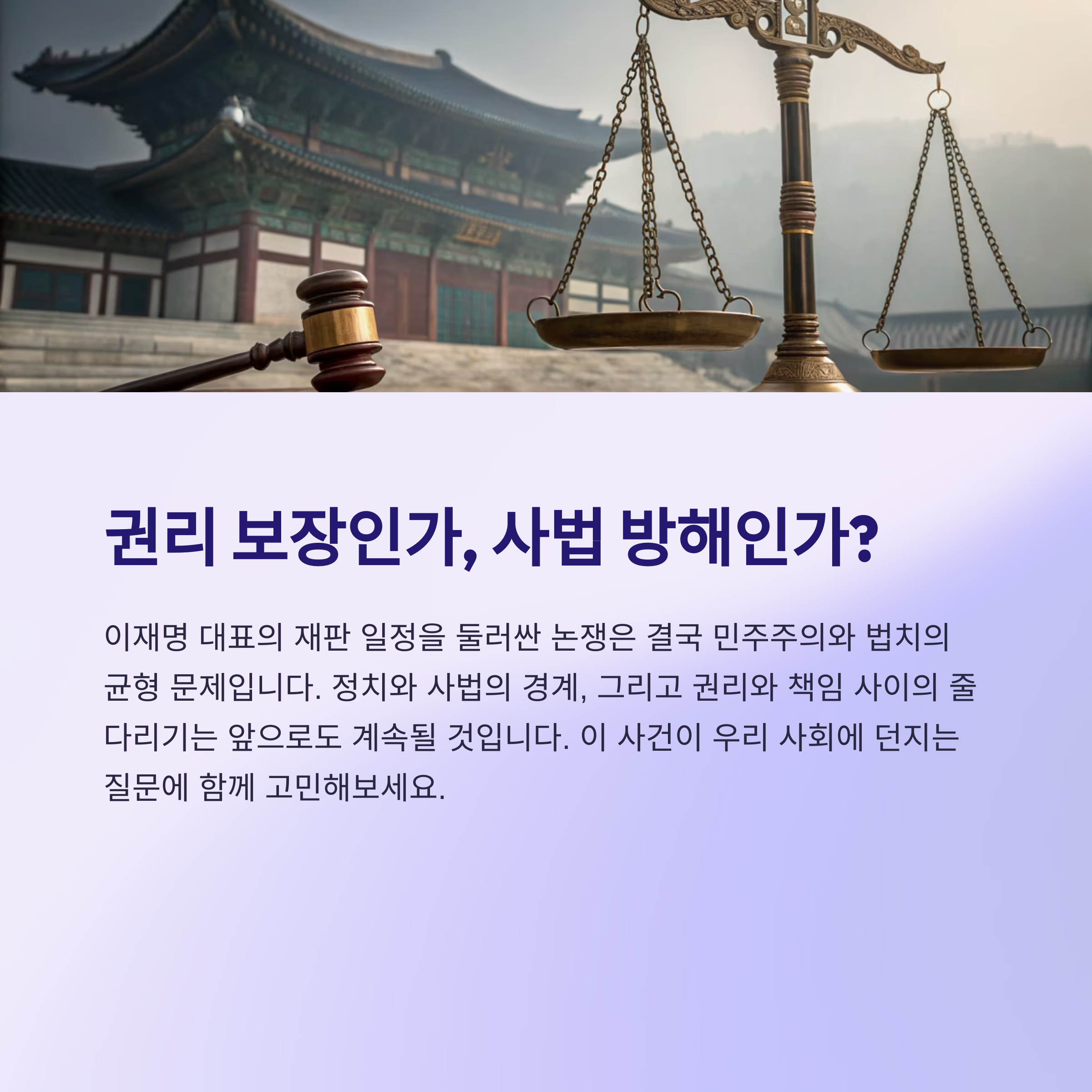 이번 논란은 사법부의 독립성에 대한 시험대입니다. 법원은 정치적 압력 없이 오직 법과 증거에 따라 판단해야 합니다. 하지만 특정 정당이 공판 일정에 개입하려는 시도는 사법부를 정치에 종속시키려는 행위로 해석될 수 있습니다. 재판은 정치적 정무 판단이 아닌, 헌법과 법률에 따른 사법 판단으로 진행되어야 합니다.