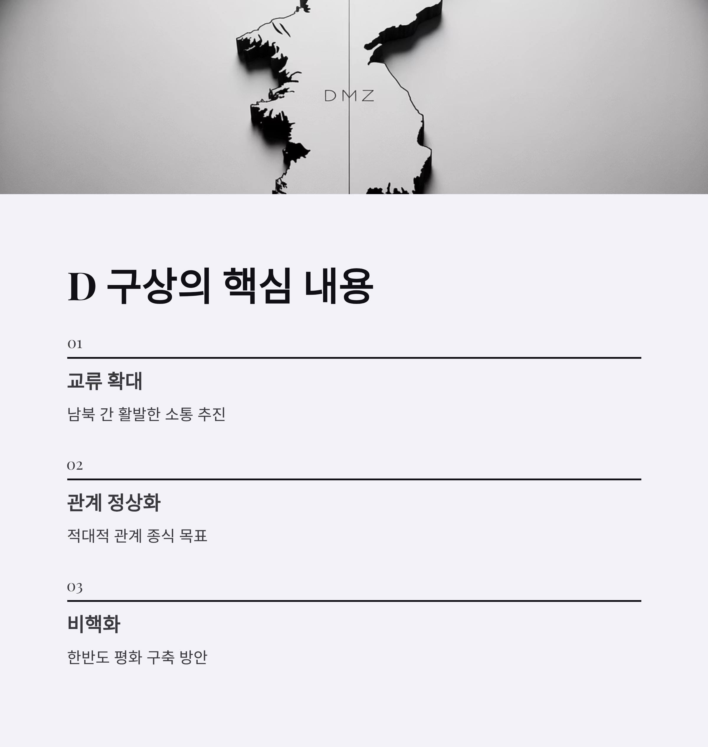 | A. D 구상은 남북 간 교류, 관계 정상화, 비핵화를 통해 평화를 정착시키고자 하는 방안을 말합니다. 이는 기존 협력 노력을 확장시키려는 목표를 지니고 있습니다. |
