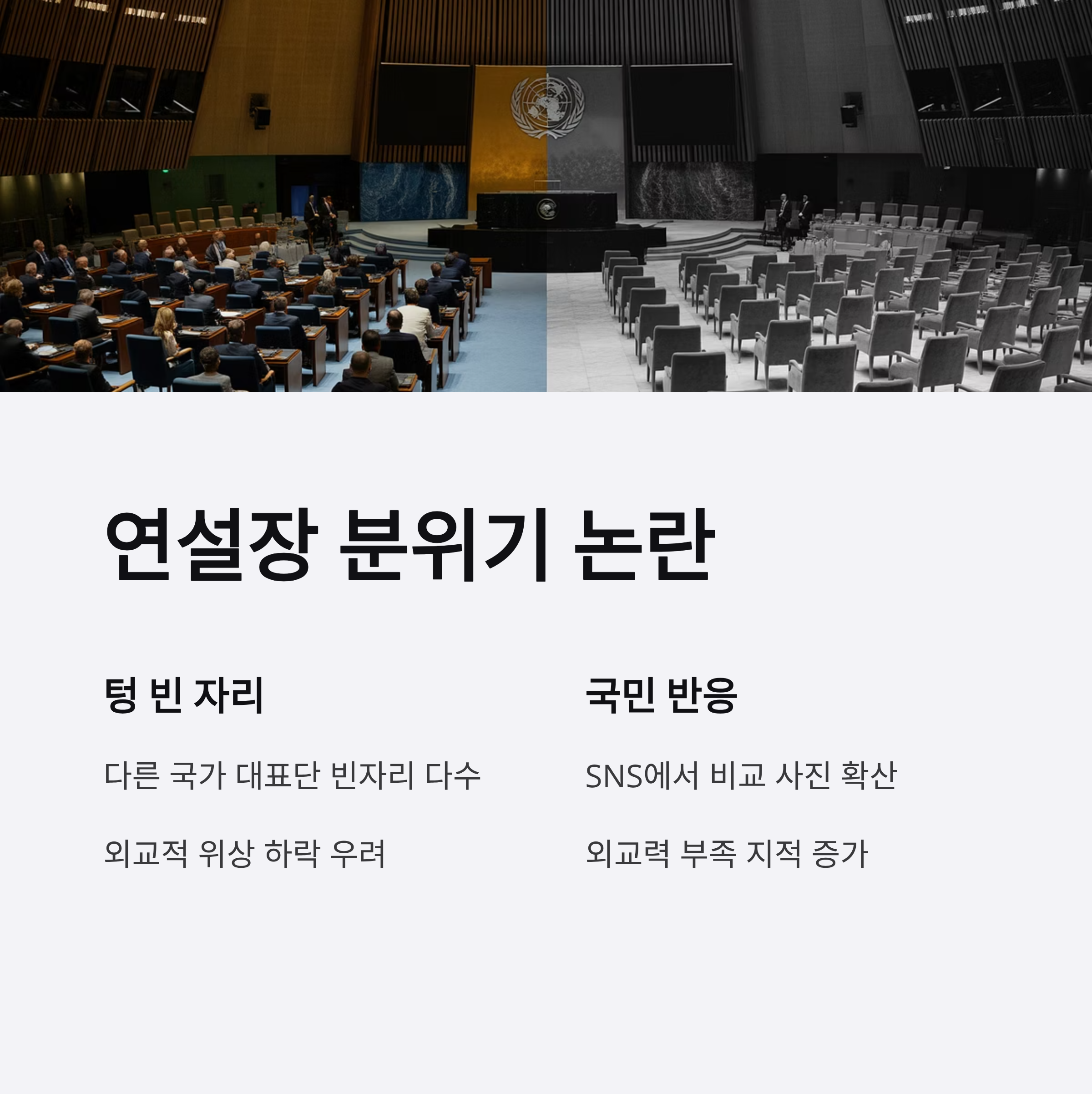 | A. 빈 좌석은 연설 내용에 대한 관심 부족과 더불어 한국의 외교적 영향력이 여전히 제한적이라는 부정적 이미지를 줄 수 있기 때문에 논란이 되었습니다. |