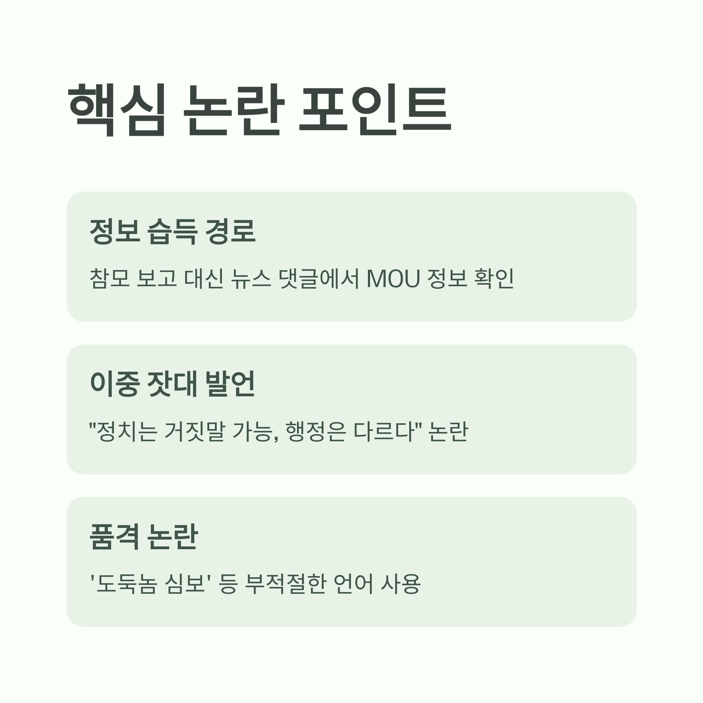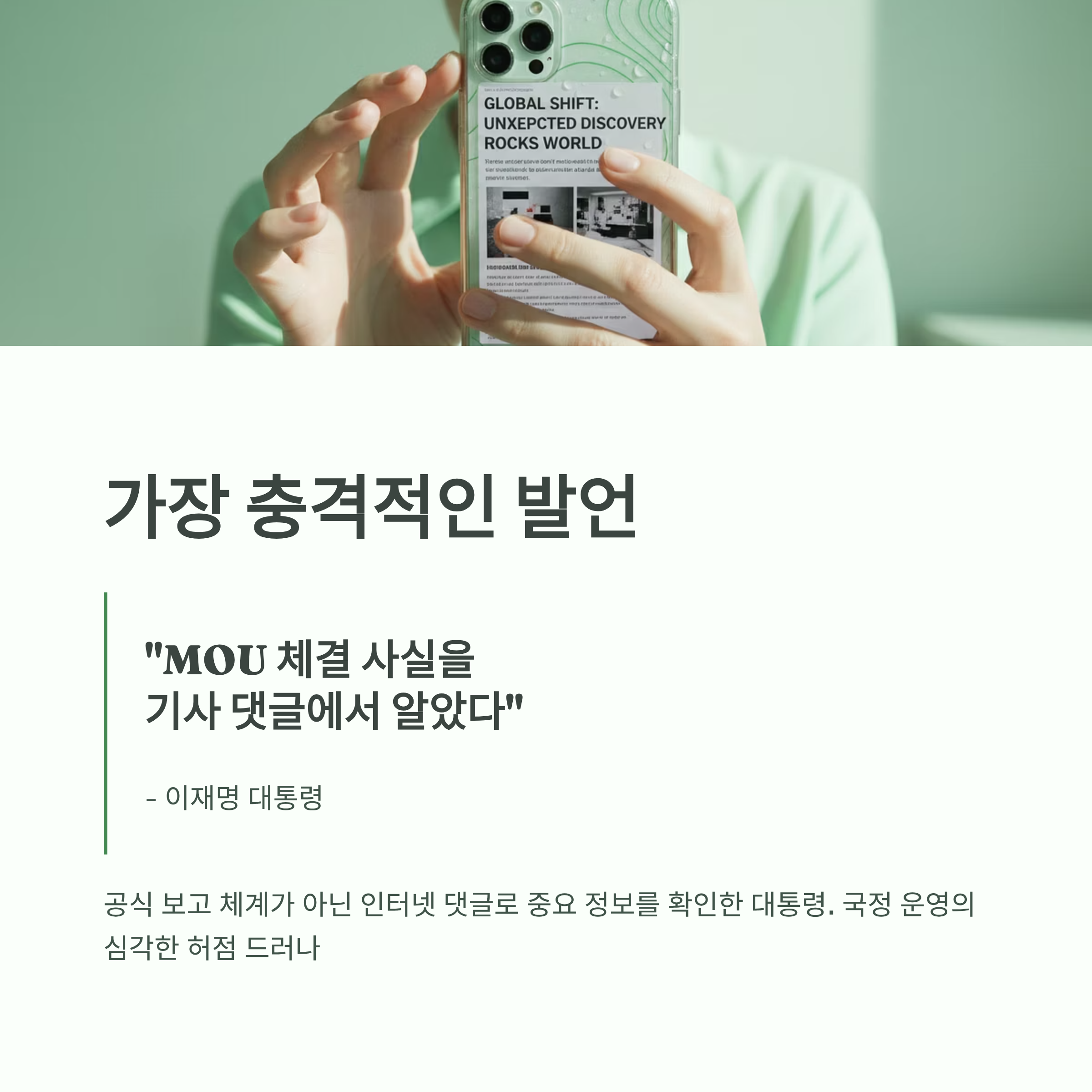 - 이재명 대통령은 MOU 내용을 공식 참모가 아닌 기사 댓글에서 인지했다고 발언해 충격을 주었습니다.