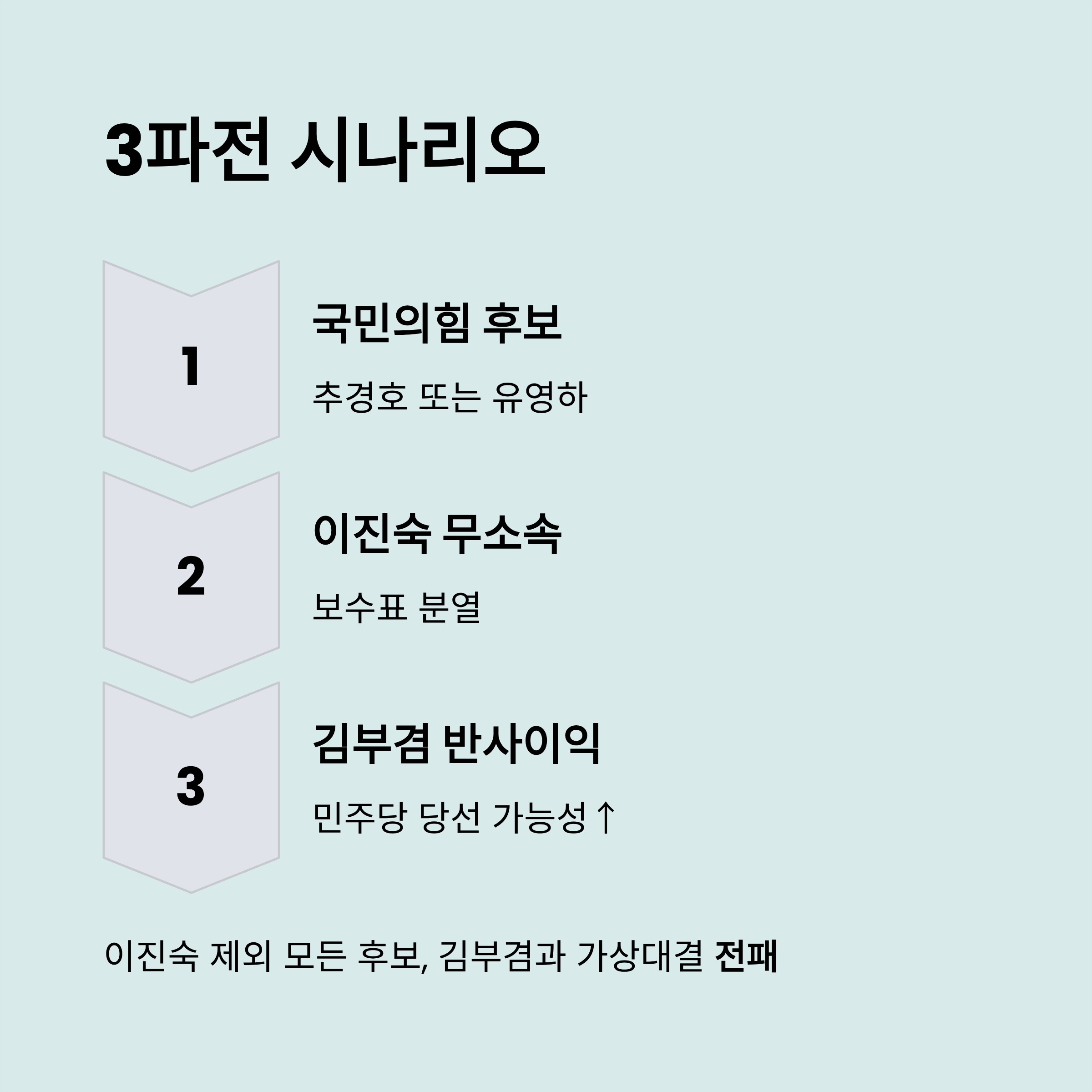 이진숙 전 위원장의 컷오프는 대구시장 선거판을 뒤흔든 시작점이었습니다. 함께 컷오프된 주호영 의원은 즉각 불출마를 선언하며 당의 결정을 수용했지만, 각종 여론조사에서 김부겸 후보를 앞서는 유일한 주자로 꼽혔던 이 전 위원장은 강력히 반발하며 무소속 출마 가능성을 열어뒀습니다. 이는 곧바로 '보수 분열'이라는 현실적인 위협으로 다가왔습니다. 현재 국민의힘 경선은 추경호, 유영하 두 후보의 양자 대결로 좁혀졌지만, 이들 중 누가 최종 후보가 되더라도 이 전 위원장이 무소속으로 출마할 경우 선거는 3파전 구도로 흐르게 됩니다. 이러한 상황은 보수 진영에게는 최악의 시나리오입니다. 보수 성향 유권자들의 표가 국민의힘 후보와 이진숙 후보로 나뉘게 되면, 단일 후보로 나선 민주당 김부겸 후보가 반사이익을 얻어 당선될 가능성이 매우 높아지기 때문입니다. 실제로 본문 내용에 따르면, 이 전 위원장을 제외한 나머지 후보들은 김부겸 후보와의 가상대결에서 모두 패배하는 것으로 나타났습니다. 이는 ‘보수의 심장’이라 불리는 대구에서 시장직을 민주당에 내줄 수 있다는 위기감을 증폭시키는 핵심 데이터이며, 당이 이 전 위원장 설득에 사활을 거는 가장 큰 이유입니다.