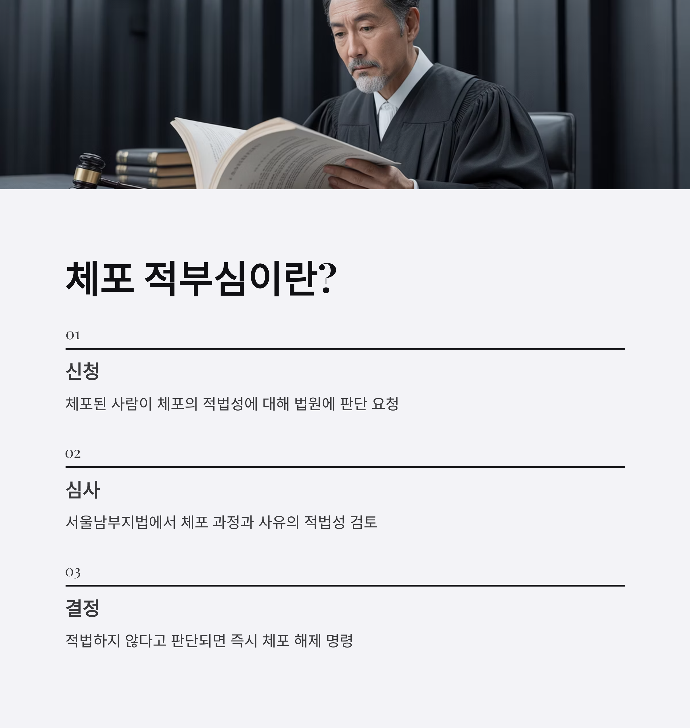 A. 체포 적부심은 체포된 사람이 그 체포가 적법했는지 재판부에 판단을 요청하는 제도입니다. 적법하지 않다고 판단되면 법원은 체포를 즉시 해제할 수 있습니다. |