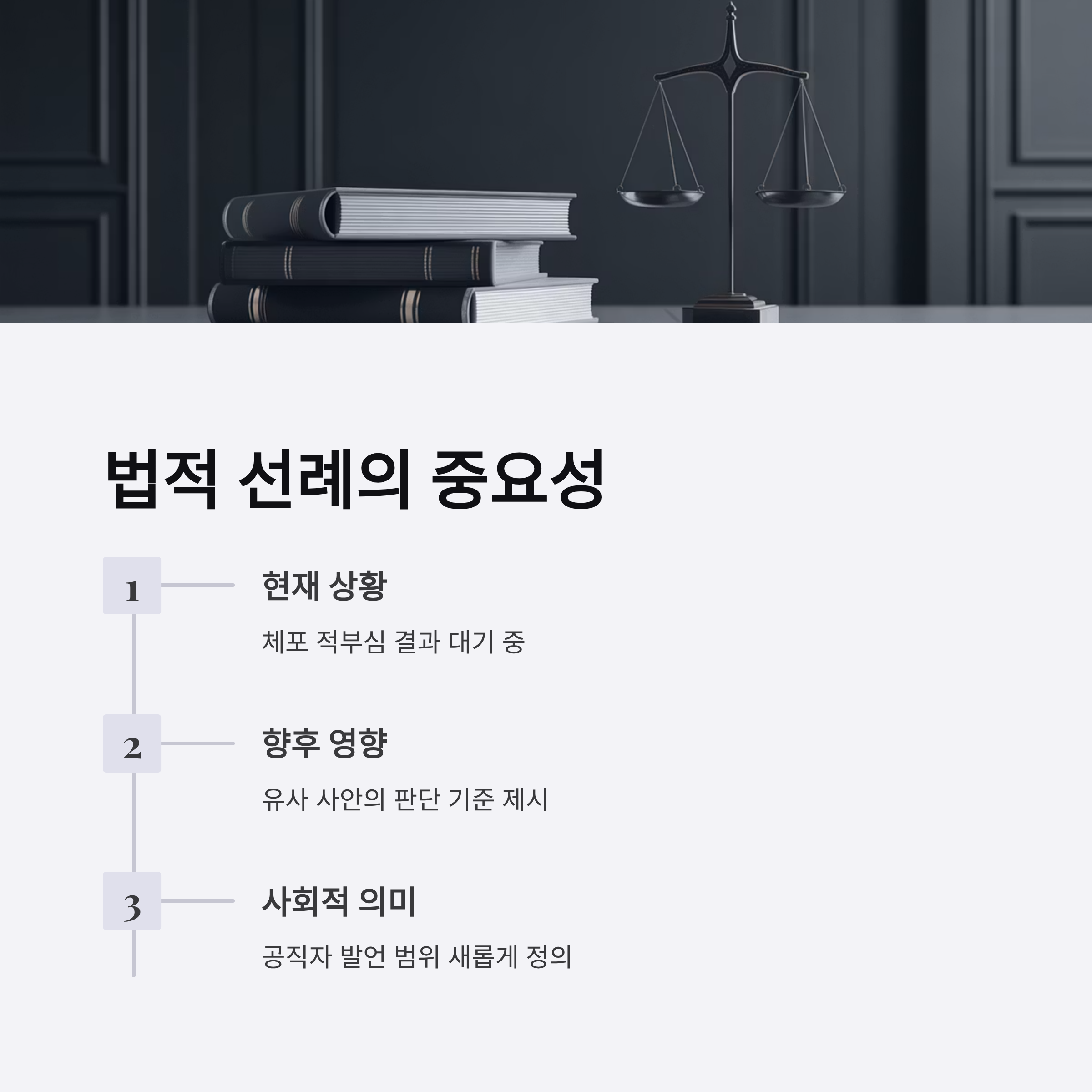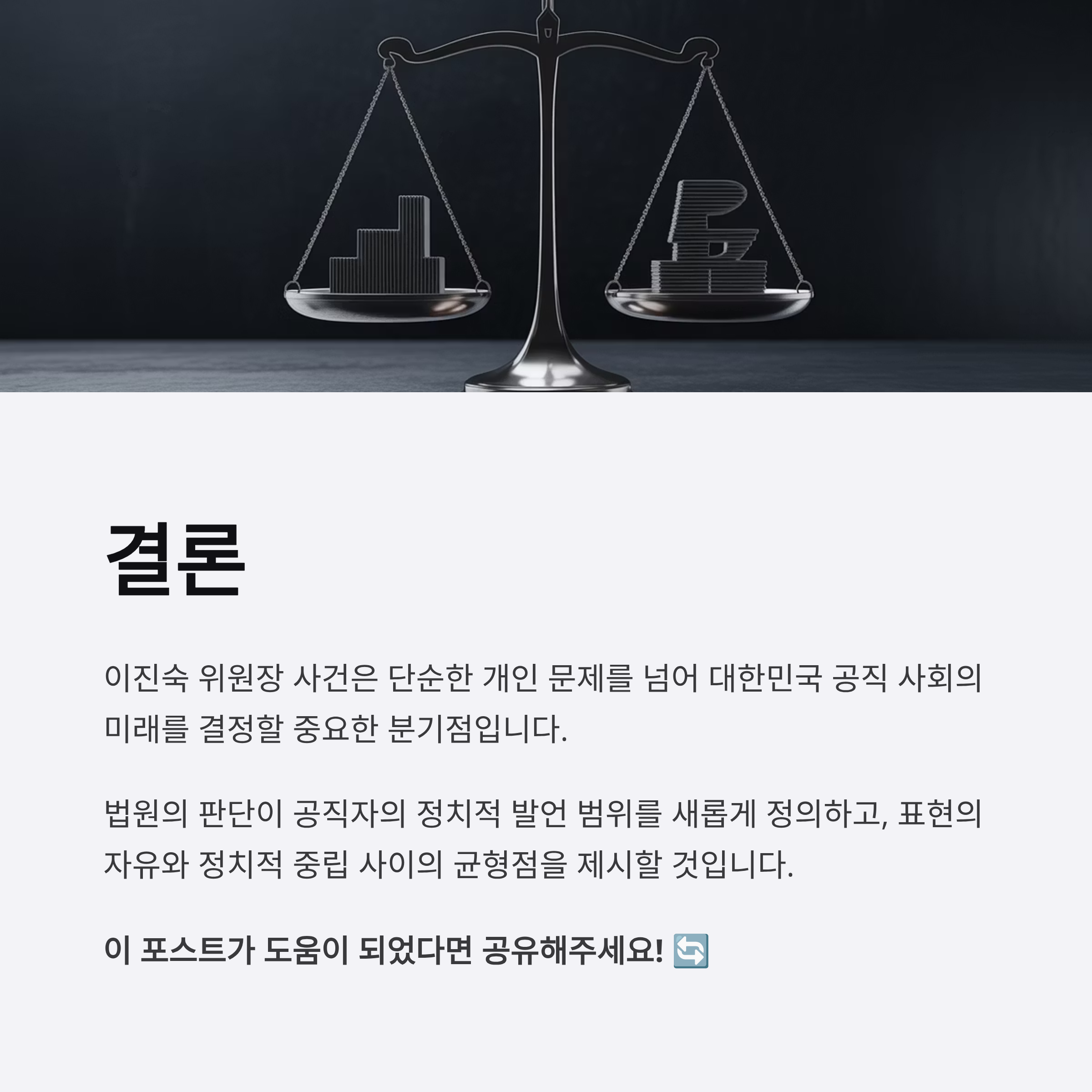 이진숙 방송통신위원장 체포 사건은 단지 공직자의 법적 의무 준수 여부를 넘어, 표현의 자유와 정치적 중립이 조화를 이루는 사회의 방향성을 묻는 중요한 논점입니다. 체포 적부심 결과는 단순히 한 개인의 법적 문제를 넘어서 앞으로 있을 유사한 사안들에서 어떠한 기준으로 판단해야 하는지 법적 선례를 남길 것입니다. 또한 이 사안은 대중에게 공공 영역에서의 표현 자유와 제약 사이의 경계를 한층 더 명확히 이해할 기회를 제공합니다. 이제 법원의 결과에 따라 향후 대한민국 공직자의 정치적 발언과 행동의 가능 범위가 새롭게 정의될 것입니다.