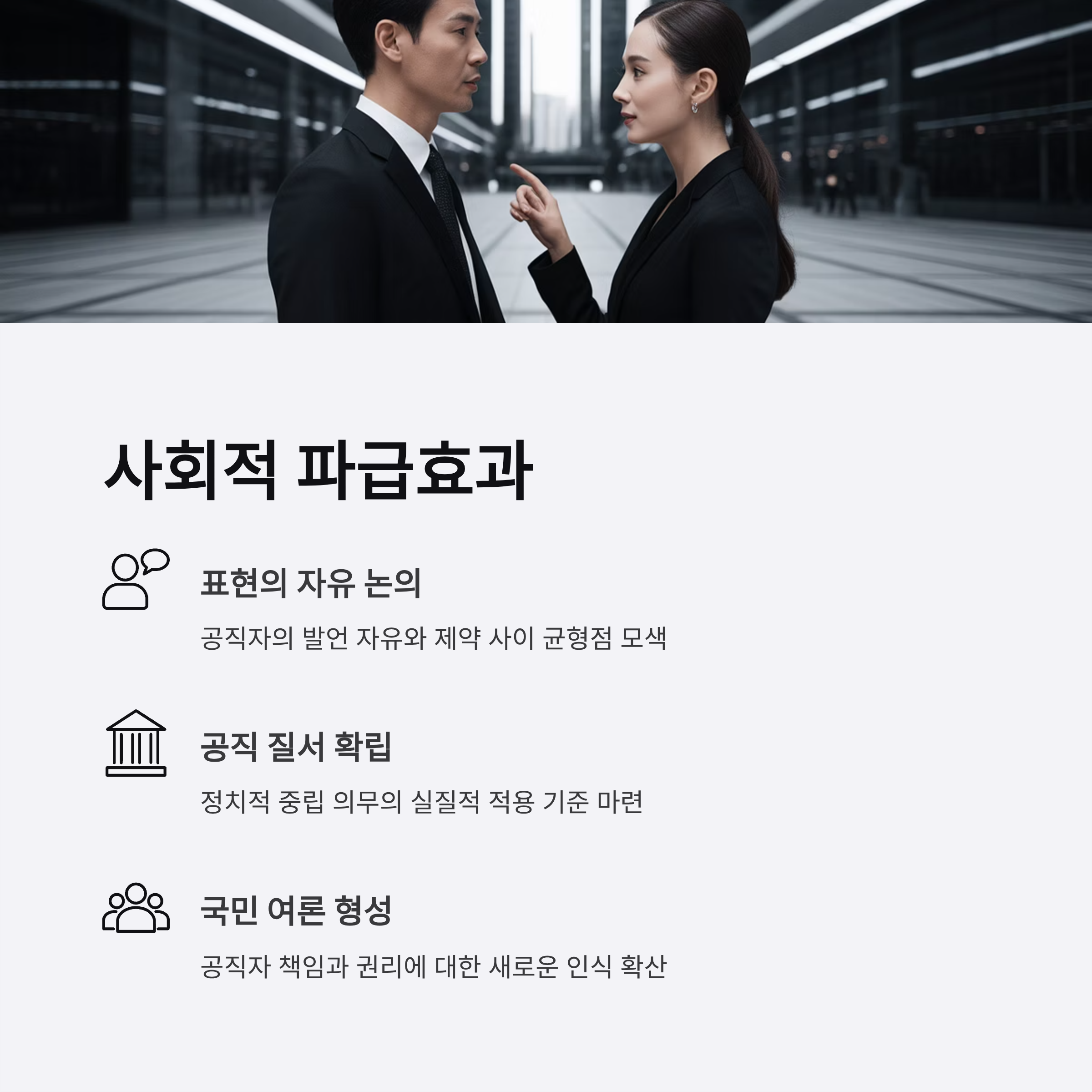 A. 사회적으로 표현의 자유와 정치적 중립 논의가 선명하게 대두될 것입니다. 또한 공직자 발언 범위와 한계 설정의 중요성이 강조되며, 국민 여론 역시 공직자의 책임과 자유에 대한 새 틀을 요구할 수 있습니다. |