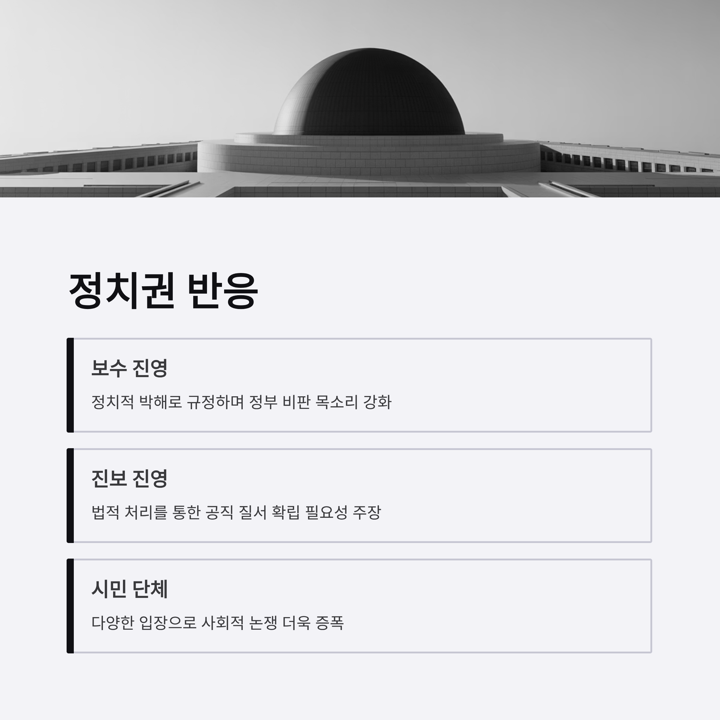 체포 뉴스 이후 다양한 정치권 인사와 시민 단체들의 반대 목소리가 이어졌습니다. 보수 진영에서는 이를 정치적 박해로 규정하며 정부 비판에 나섰으며, 반대로 일부 진보 진영은 법적 처리를 통한 공직 질서 확립의 필요성을 주장했습니다. 상호 간 긴장된 입장 표명은 이 사건의 법적 쟁점만이 아니라 사회적 분위기 전반에까지 영향을 미칠 전망입니다.