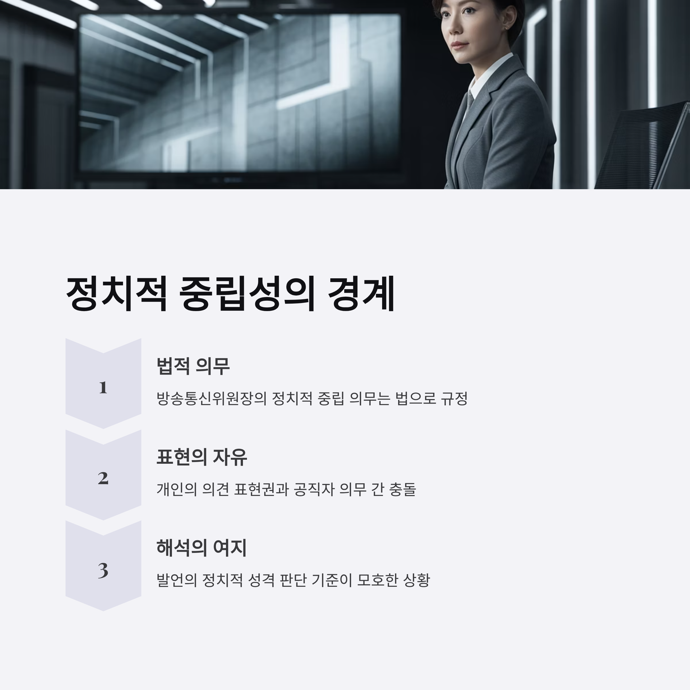 방송통신위원회 위원장은 법적으로 정치적 중립의 의무를 갖습니다. 이진숙 위원장의 일부 유튜브 발언이 특정 정치 세력을 지지하거나 비판하는 내용으로 해석되면서 논란이 증폭되었습니다. 하지만, 해석의 여지가 있는 발언과 명백한 법 위반 간의 경계가 불분명하여 표현의 자유와 정치적 중립 의무 간 충돌 문제가 더욱 복잡해졌습니다. 미래의 공직자 사안에서도 이와 같은 유사 판례가 기준으로 작용할 가능성이 큽니다.