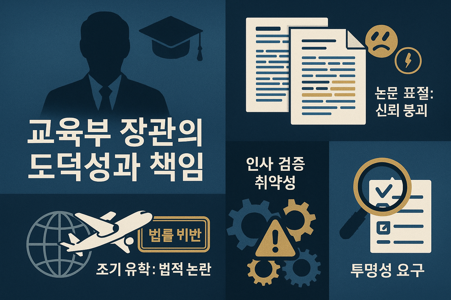 교육부 장관은 국가의 미래를 책임지는 중요한 직책으로, 도덕성과 능력을 동시에 갖춘 인물이 요구됩니다. 최근 논란의 중심에 선 이진숙 교육부 장관 후보자는 논문 표절 의혹과 자녀 조기 유학 중 법률 위반 정황으로 인해 국민적 비판을 받고 있습니다. 특히, 자신이 지도한 제자의 연구물을 자신의 이름으로 등재한 사례는 연구 윤리를 심각하게 손상시키는 사건으로 평가됩니다. 이에 후보자로서의 자질과 검증 체계의 문제점이 대두되고 있습니다. 이에 본 글은 논문 표절의 도덕적 및 구조적 문제, 자녀 교육과 관련된 법률적 논란, 그리고 인사 검증 체계의 허점을 분석하여 교육부 장관 후보자로서의 적합성 여부를 심도 있게 논의하고자 합니다.