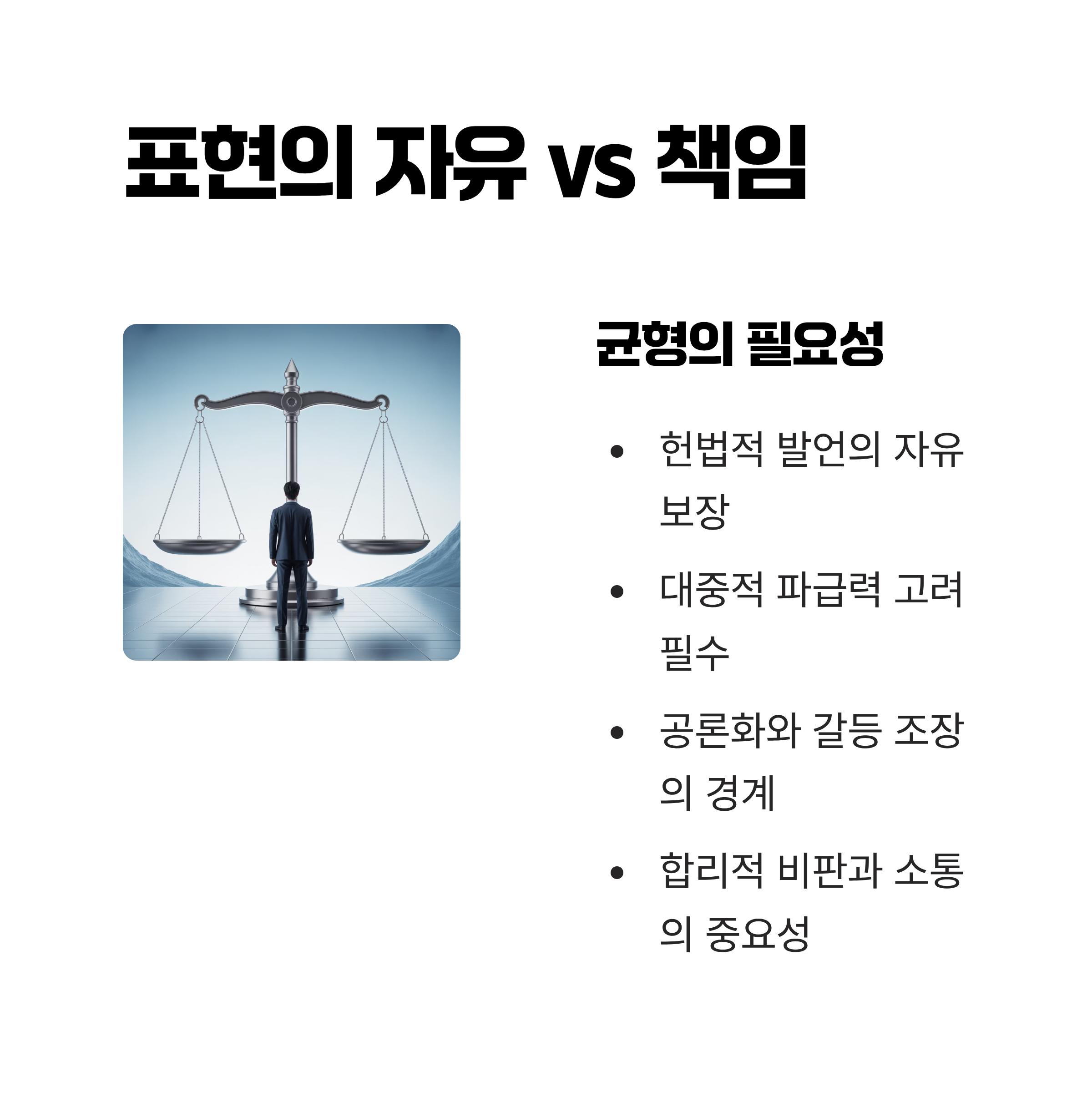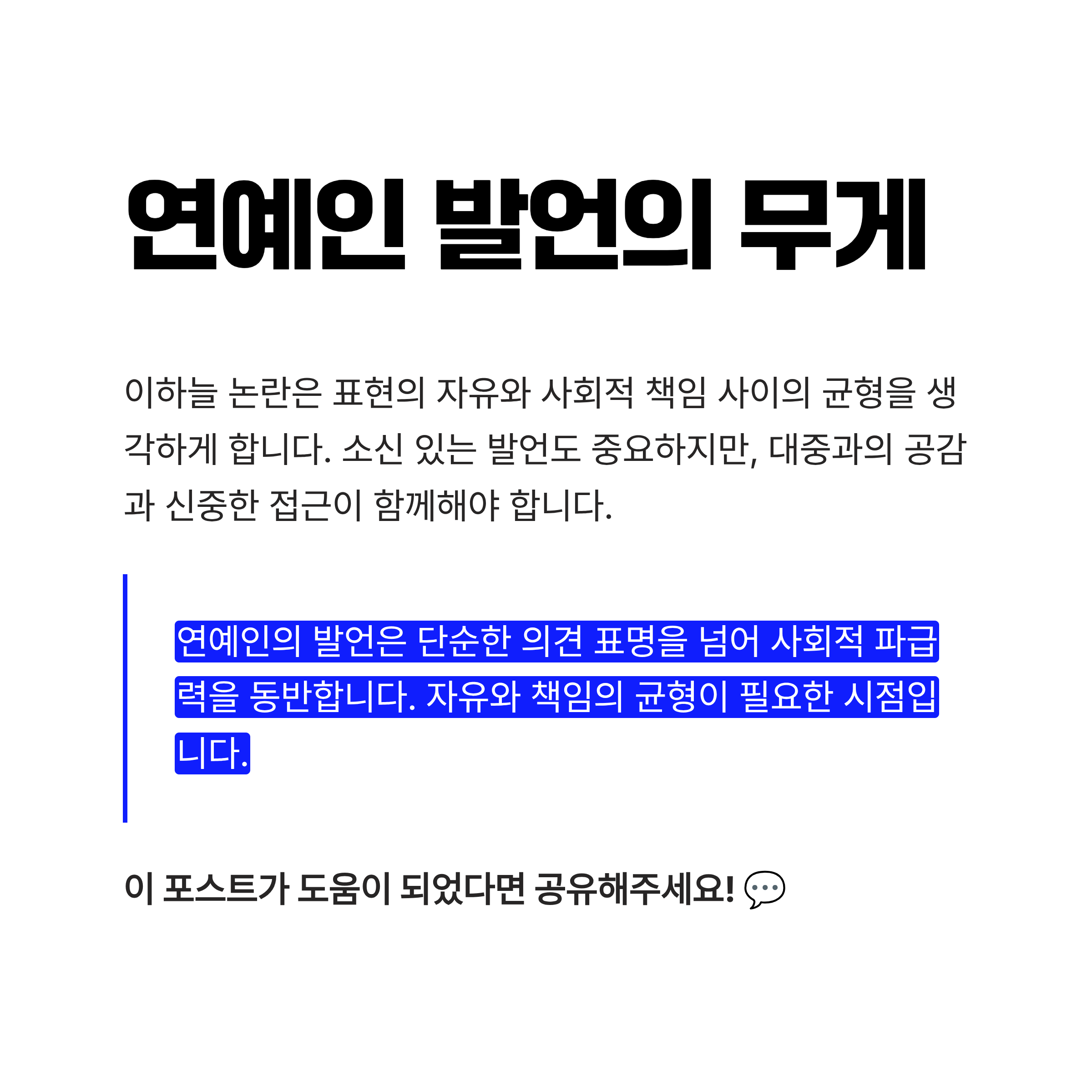 연예인의 발언은 대중과의 소통이기도 하지만, 동시에 대중적 책임을 수반합니다. 특히 정치적, 사회적인 견해는 단순한 발언 이상으로 여론에 실질적인 영향을 미칠 수 있습니다. 이하늘의 사례는 발언이 가져오는 사회적 반향과 논란의 긍정적·부정적 결과를 다시 생각하게 합니다. 그의 발언은 의도와 상관없이 연예인이 정치적 메시지를 전달할 때 감정적인 수준을 넘어서 합리적이고 균형 잡힌 태도로 접근해야 한다는 점을 강조합니다. 이는 공론화를 불러일으킬 수 있지만 갈등을 조장하는 형태로 흘러서는 안 됩니다.