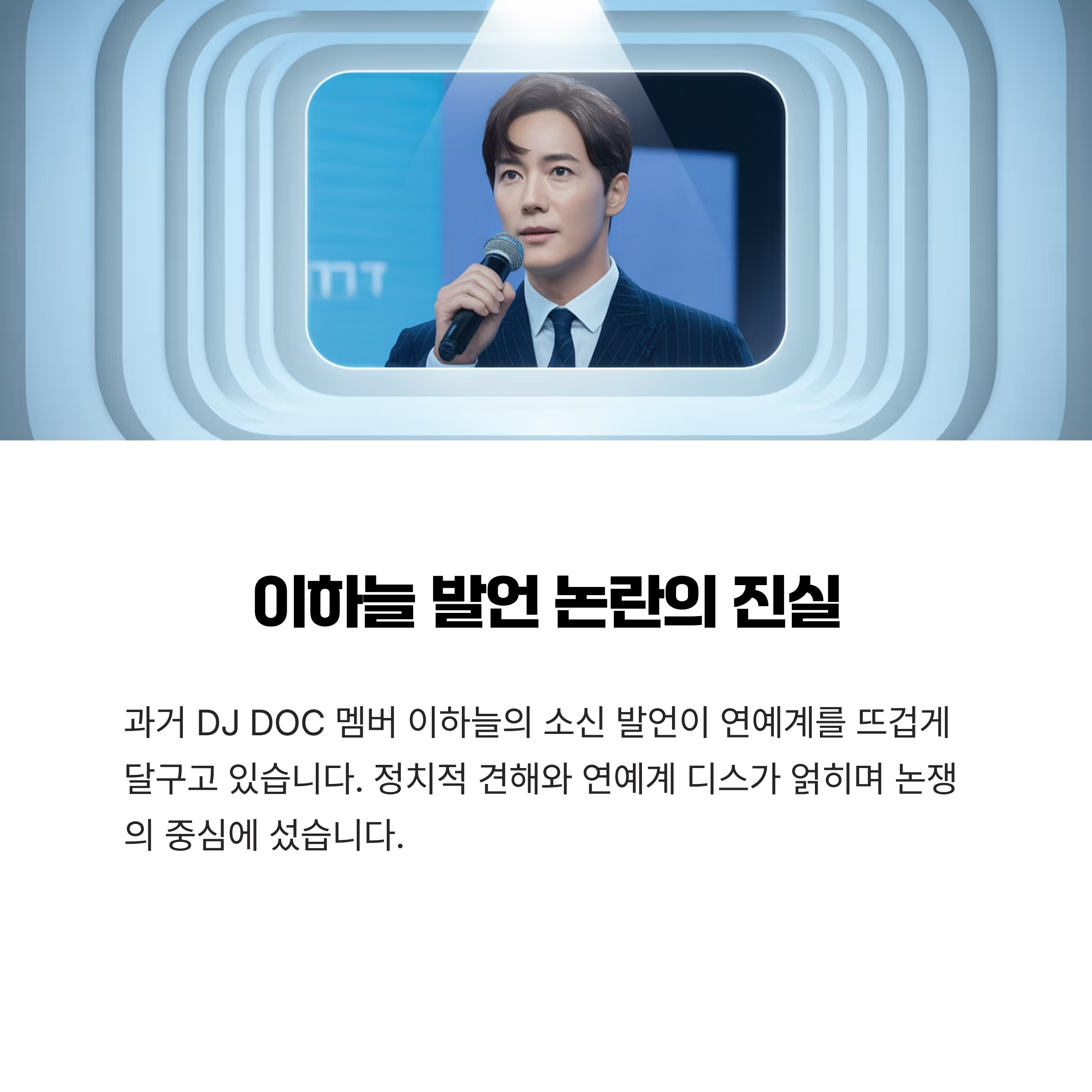 최근 가수 이하늘의 발언이 연예계와 대중사회를 뜨겁게 달구고 있습니다. 과거 DJ DOC에서 활동하던 그는 이번에는 정치와 사회적 발언을 통해 또 한 번 화제의 중심에 섰습니다. 특히 특정 정치적 입장과 개인적 의견을 강하게 표출한 그의 소신 발언은 다양한 반응을 일으켰습니다. 연예계 내부 디스와 사회적 문제 언급이 한데 얽히며 뜨거운 논쟁의 장이 열렸습니다.