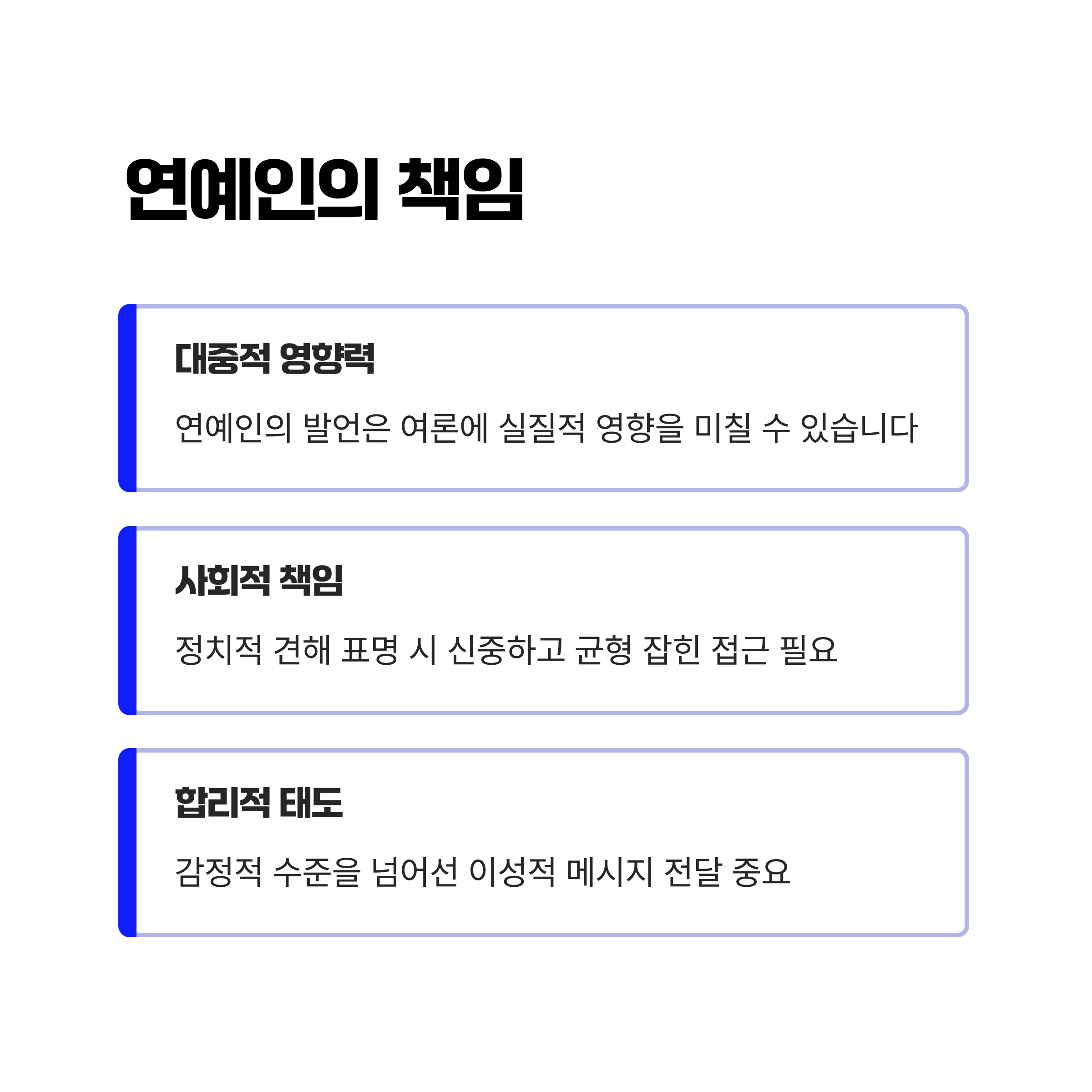 A. 연예인도 헌법적으로 정치적 발언의 자유를 누릴 수 있지만, 대중적 영향력을 가진 만큼 부적절하거나 과도한 발언이 가져올 파급력을 고려해야 합니다. |