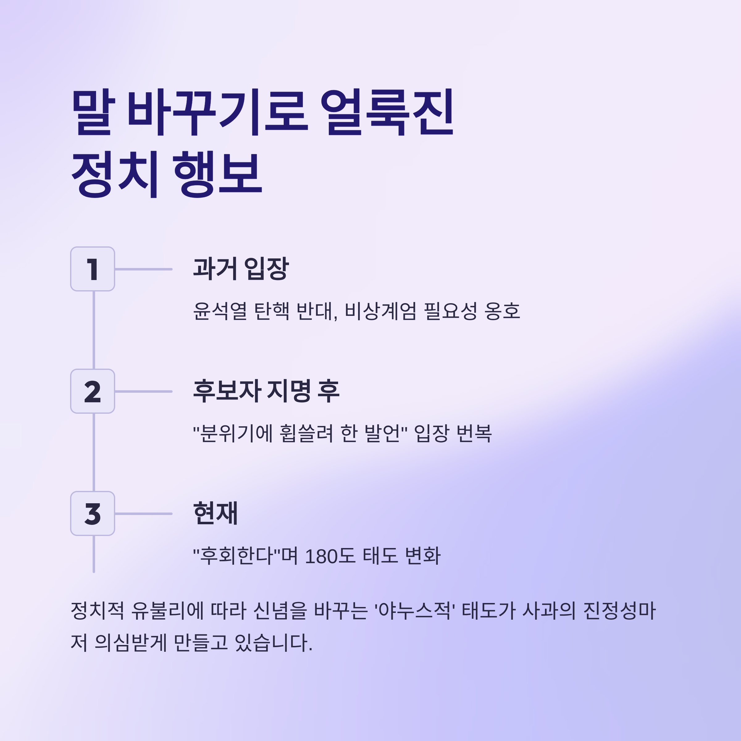 일관성 없는 정치적 태도: 과거 윤석열 전 대통령의 탄핵을 반대하고 비상계엄의 불가피성을 인정하는 듯한 발언을 했으나, 최근에는 "휩쓸려서 했던 발언"이라며 후회한다고 입장을 번복했습니다. 이러한 말 바꾸기 행태가 그의 사과의 진정성마저 의심하게 만들고 있습니다.