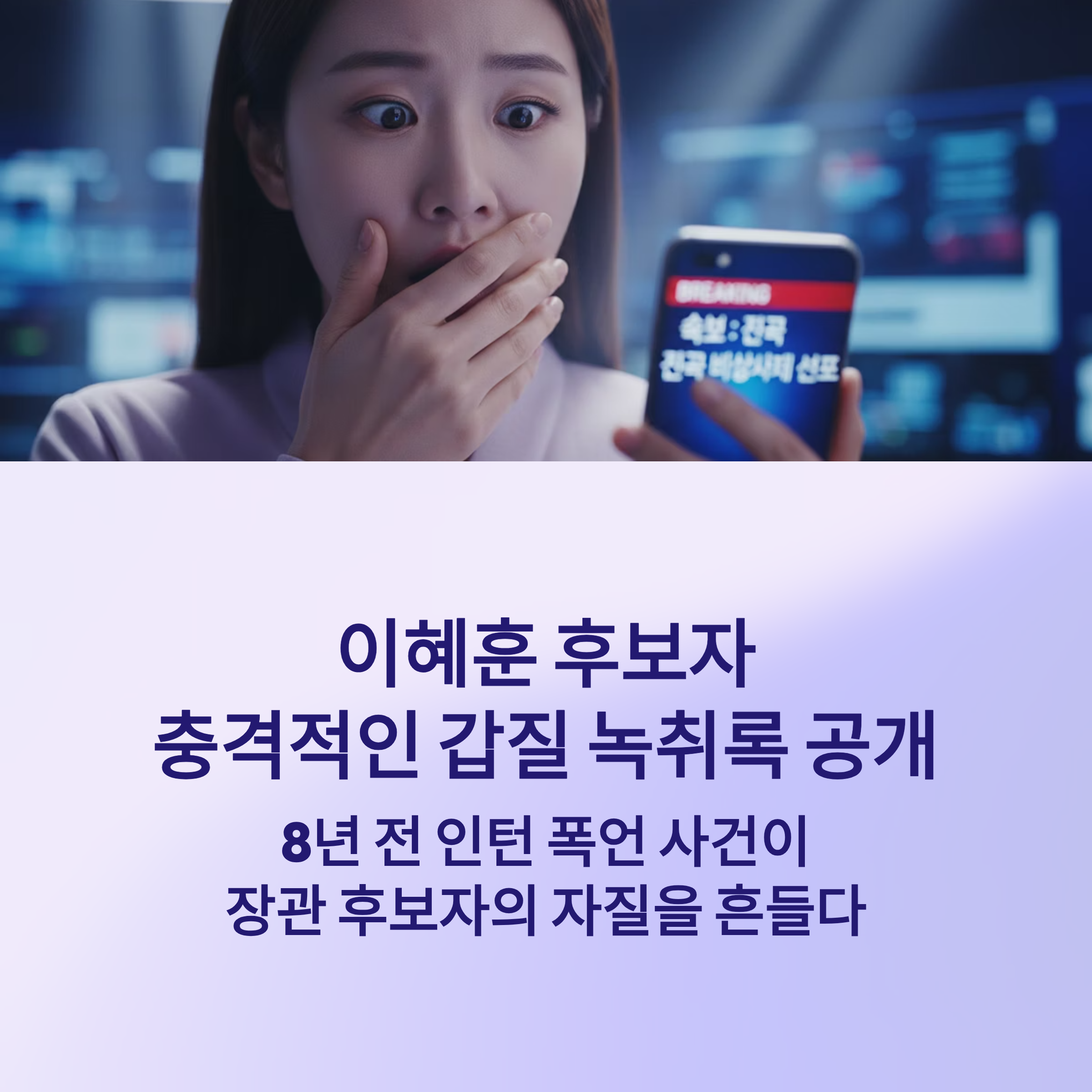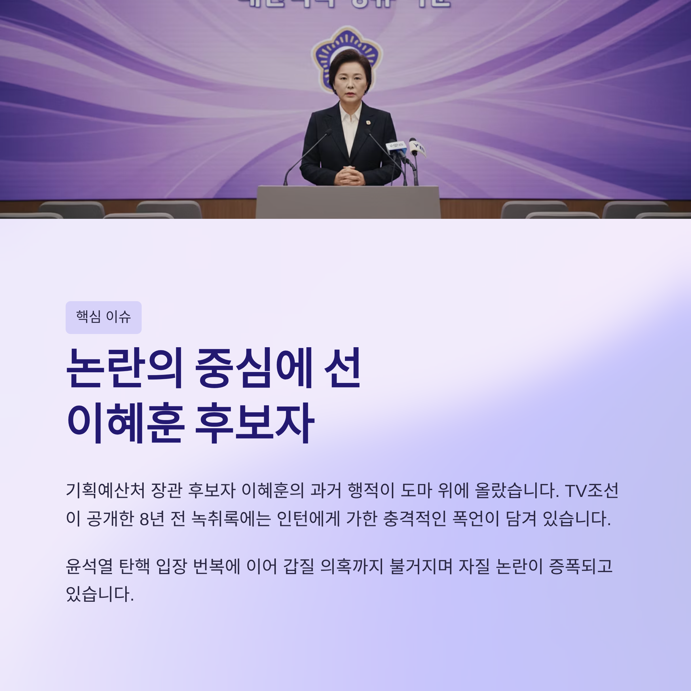이해훈 기획예산처 장관 후보자의 지명을 둘러싼 논란이 거세지고 있습니다. 과거 윤석열 전 대통령 탄핵 반대 입장에서 돌연 태도를 바꿔 비판을 받은 데 이어, 이번에는 국회의원 시절 인턴 보좌진에게 가한 상상 이상의 폭언이 담긴 녹취록이 공개되며 파문이 일고 있습니다. TV조선이 단독 보도한 8년 전 녹취 파일에는, 자신의 이름이 언급된 언론 기사를 보고하지 않았다는 이유로 인턴 직원을 약 3분간 극심하게 질책하는 내용이 담겨있습니다. "대한민국 말 못 알아들어?", "너 IQ 한 자리야?", "내가 정말 널 죽였으면 좋겠다" 등 인격 모독을 넘어선 위협적인 발언은 국민들에게 큰 충격을 주고 있습니다. 논란이 커지자 이 후보자 측은 "상처받은 분께 진심으로 사과드린다"며 고개를 숙였지만, 그의 사과가 과연 진정성을 담고 있는지에 대한 의문은 가시지 않고 있습니다. 본문에서는 이번에 공개된 폭언 녹취록의 구체적인 내용과 과거 그의 정치적 행보를 심층 분석하고, 그를 지명한 이재명 대통령의 인사 검증 시스템과 과거 발언의 모순점을 짚어보며 이해훈 후보자가 과연 국가의 예산을 책임질 고위 공직자로서 자격이 있는지 다각도로 검토해 보고자 합니다.