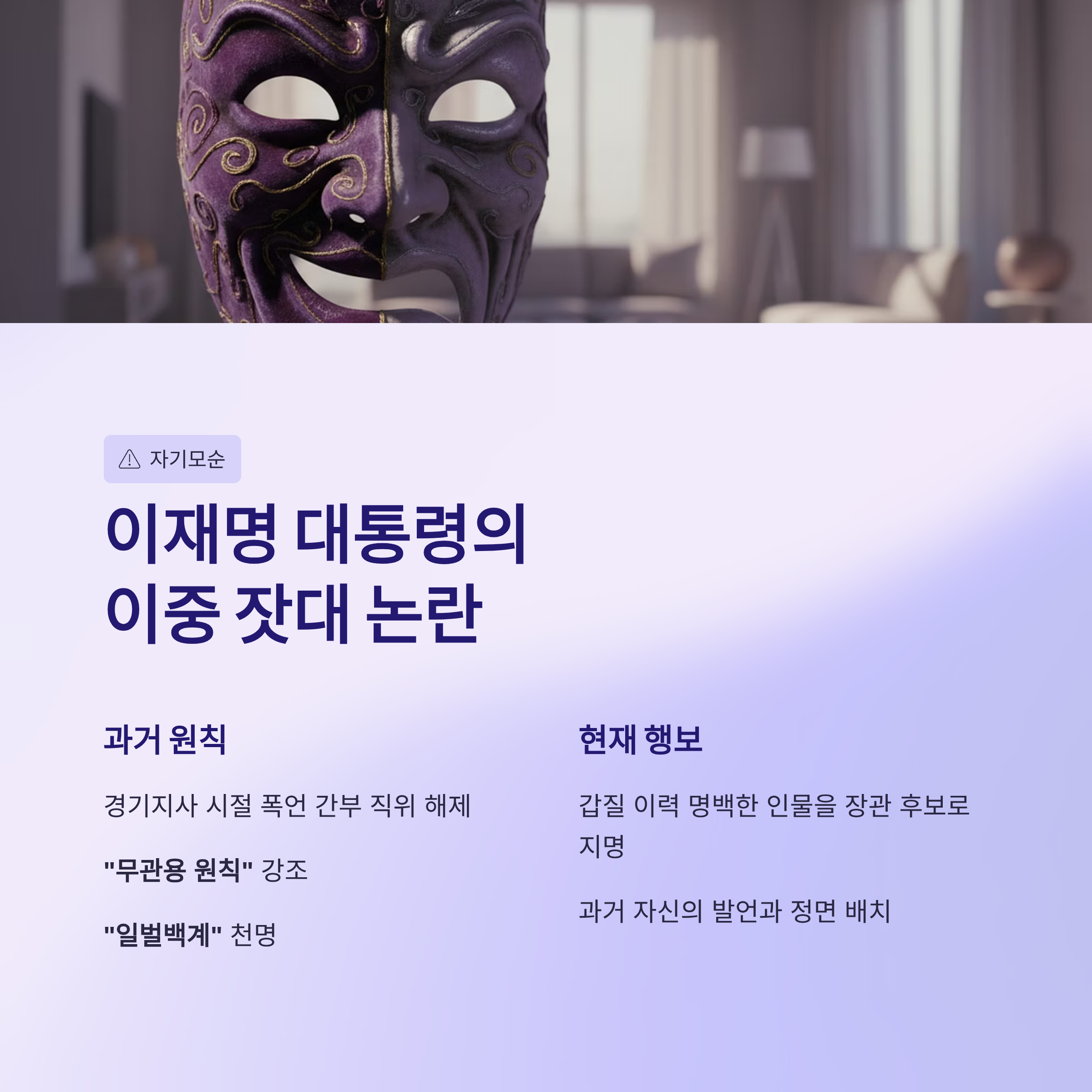 | A. 이재명 대통령이 과거 경기지사 시절 직장 내 갑질에 대해 '무관용 원칙'을 내세웠기 때문입니다. 갑질 이력이 명백한 인물을 장관 후보로 지명한 것은 과거 자신의 원칙을 뒤집는 '자기모순'이자 '이중 잣대'라는 비판을 받고 있습니다. |