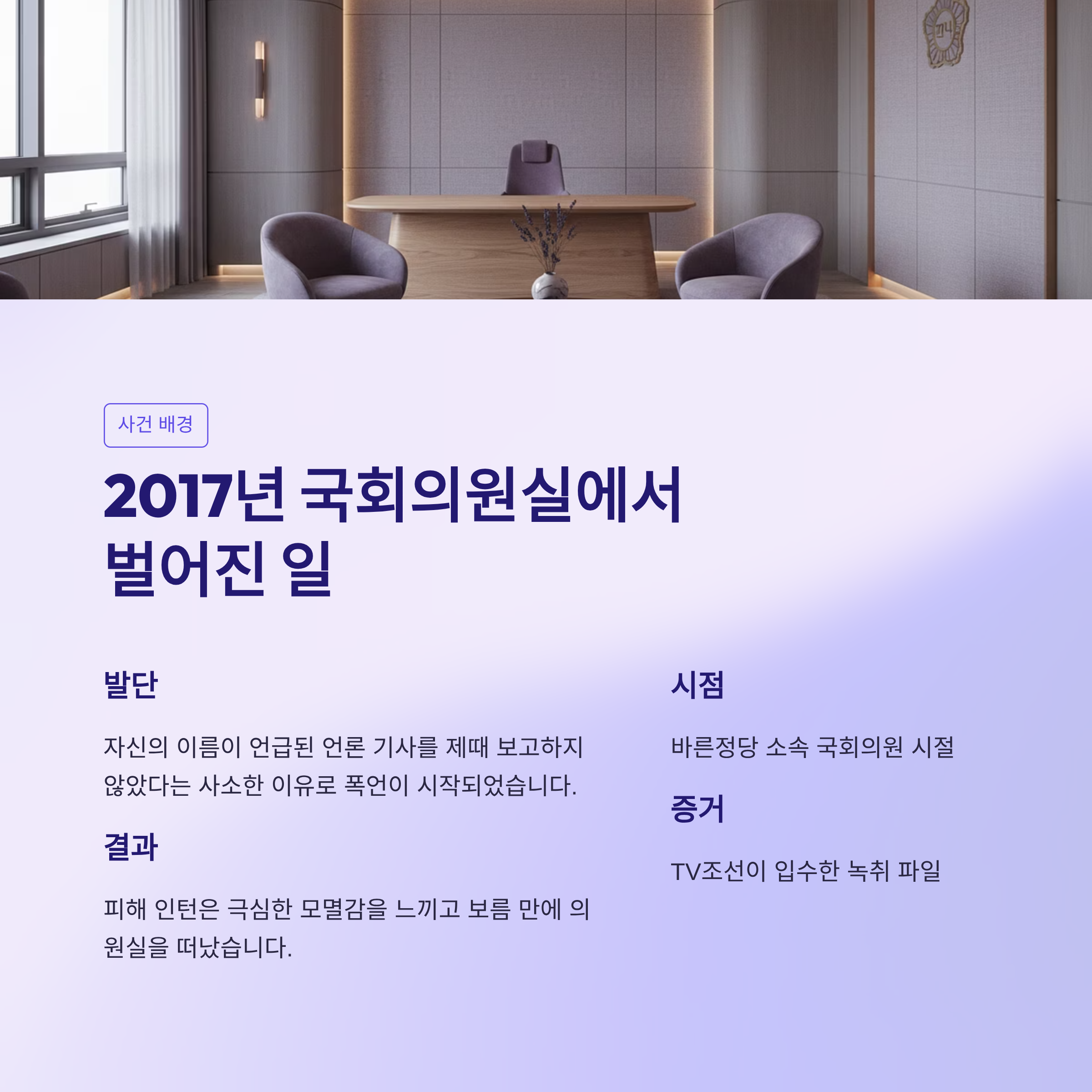 인턴 폭언 녹취록 공개: 8년 전 국회의원 시절, 본인 관련 기사를 보고하지 않았다는 이유로 인턴에게 "죽였으면 좋겠다", "IQ 한 자리야?" 등 3분간 입에 담지 못할 폭언과 고성을 퍼부은 녹취록이 TV조선을 통해 공개되었습니다. 피해자는 극심한 모멸감을 느끼고 보름 만에 의원실을 그만뒀다고 밝혔습니다.