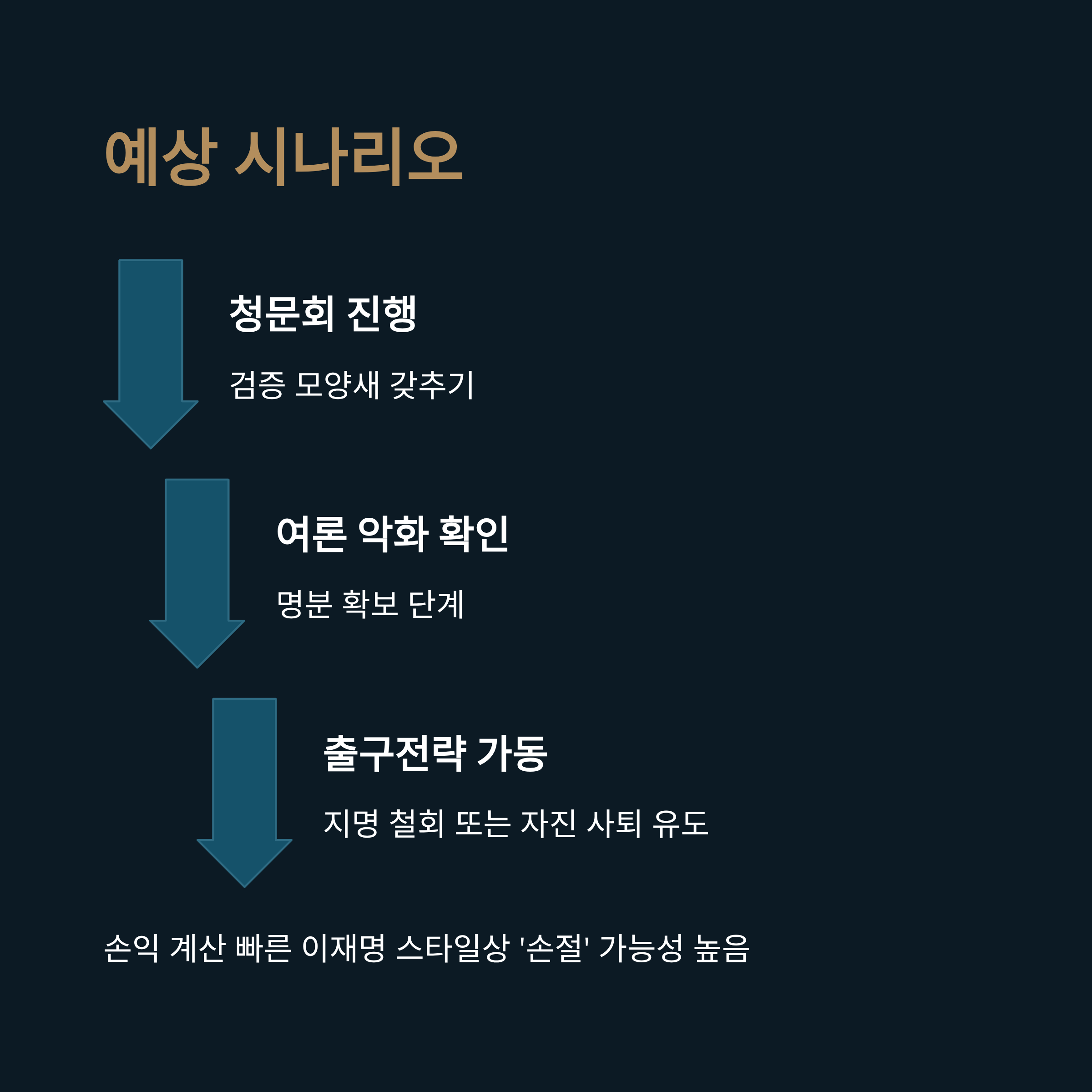 여론의 흐름에 민감하고 손익 계산이 빠른 이재명 대통령의 정치 스타일을 고려할 때, 이 후보자를 끝까지 안고 갈 가능성은 희박합니다. 현재 이 후보자 논란은 여권의 다른 이슈를 덮는 '방패막이' 역할을 하고 있지만, 이 효과도 한계가 있습니다. 결국 청문회를 통해 검증의 모양새를 갖춘 뒤, 여론을 명분 삼아 지명을 철회하거나 자진 사퇴를 유도하는 '출구전략'을 택할 가능성이 매우 높습니다. 이 대통령 입장에서는 이미 정치적 실익을 얻었기에 큰 부담 없이 '손절'할 수 있는 카드인 셈입니다.