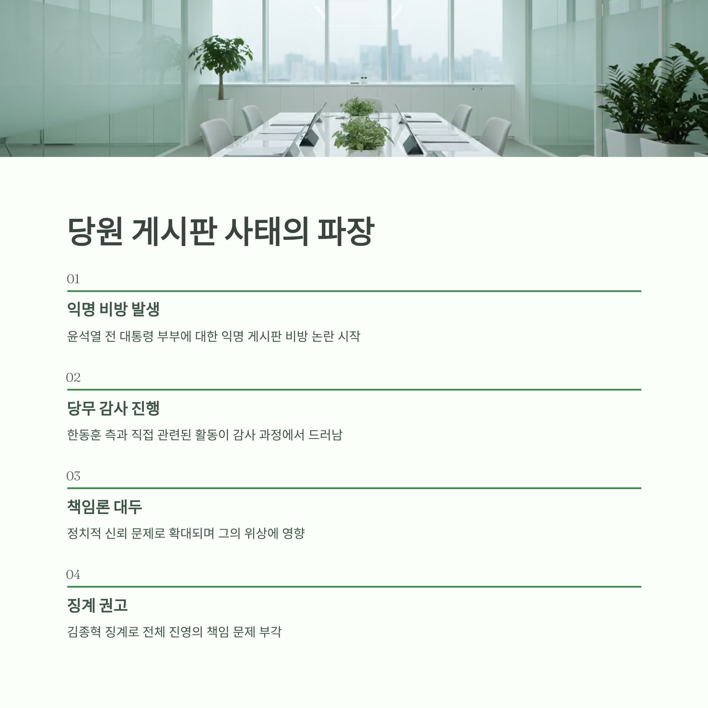 익명 게시판을 통한 윤석열 전 대통령 부부에 대한 비방 논란은 단순한 내부 갈등을 넘어 정치적 신뢰의 문제로 확대되고 있습니다. 당무 감사 과정에서 한동훈 측과 직접 관련된 활동이 드러나면서 책임론이 대두되었고, 이는 그의 정치 위상에도 심대한 영향을 끼치고 있습니다. 특히 당무감사위원회가 육하원칙에 따라 내린 김종혁의 징계 권고는 단순히 개인의 행위를 넘어, 전체 진영의 책임 문제를 부각시키고 있는 만큼 정치적 파급력이 크다고 볼 수 있습니다.
