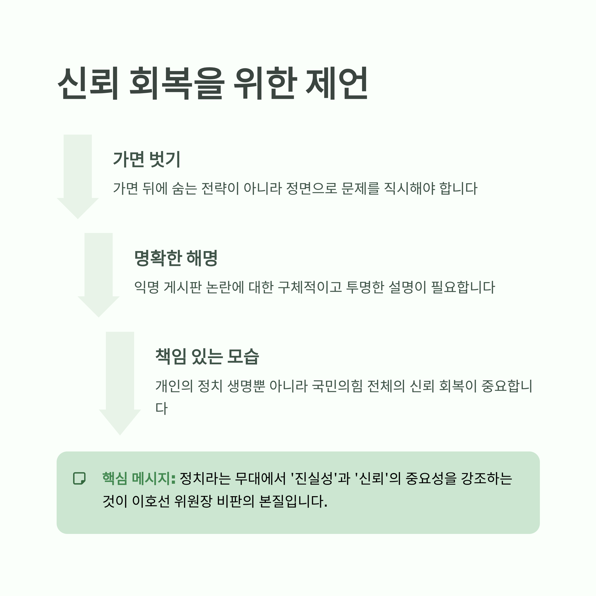 이호선 위원장은 한동훈 전 위원장을 '가면'의 비유로 강하게 비판하며 다음과 같은 쟁점들을 제기했습니다: